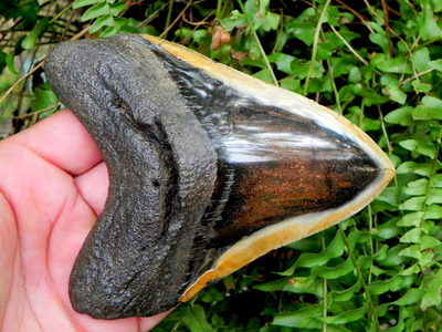 The megalodon shark lived in the Miocene/ Pliocene era approximately 12 million years ago. Megalodon grew up to 60 feet long and had a deadly arsenal of 147 razor sharp teeth. There have been teeth found that exceed 7" long ! The formula for figuring length of the shark is done by the primary tooth measurements . Standard Measurements are taken from the tip to the longest root side. For every eighth of an inch equals 1 foot in length. There fore a 7" tooth would be 56' long. The megalodon fed on whales squid,large fish and anything that moved. The power of its jaws was incredible. They could slash through vertebrae and rib bones with ease. They could even slice through their own teeth teeth!
