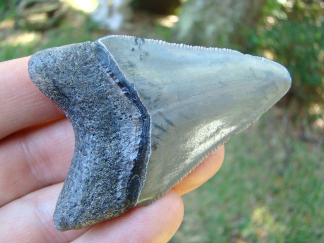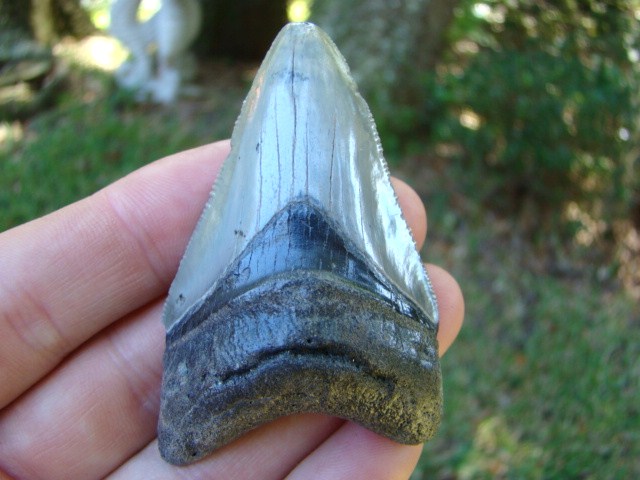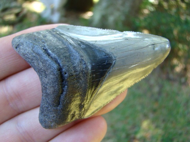 | JTSSHARKSTEETH_COM Be sure to always check out: View New Auctions  View New Store Items Add Site To Favorite Stores Please Join My Mail List For New Items    Megalodon Shark Tooth   What is a Megalodon ? The megalodon shark meaning "big tooth shark" was a giant shark  that lived in the late miocene/ pliocene era between 18 million to 3 million years ago and was the apex predator of its time. Megalodon became extinct in the Pliocene epoch about 3 million years ago. It is the largest carnivore fish/shark known to have existed . Scientist  beleive Megalodon could grow to more than 60 feet long. Megalodon would feed on anything and every thing including Giant Squids and Whales with its deadly arsenal of 184 razor sharp  teeth . There have been teeth found that exceed 7" long ! The formula for figuring length of the shark is done by the primary tooth measurements . Standard Measurements are taken from the tip to the longest root side. For every eighth of an inch equals 1 foot in length. There fore a 7" tooth would be 56' long. The megalodon fed on whales squid, large fish and anything that moved. The power of its jaws was incredible. They could slash through vertabrae and rib bones with ease. They could even slice through their own teeth teeth! When I dive I can find as many whale inner ear bones as sharks teeth lying on the bottom. This is amazing because a whale only has 2 inner ear bones! The whales were getting slain constantly to feed these huge beasts !!  HOW ARE THEY FOUND ? These teeth are found diving in rivers and off the coast of South carolina. In the Rivers the divers have to dive in extremely high currents with little to no visibility just groping around. Some of the other dangers are stingrays , sharks, gators and boat traffic to name a few. The reason you can find teeth in these rivers is the coast line has moved in and out over millions of years. The conditions divers endure off the coast are long rides in brutally Rough water , Bad Weather , predators, climbing back on the boat in rough waters to name a few ! Several divers have lost thier lives diving for megalodon teeth including the Megalodon Man Vito Bertucci. There will be more to come . I have personally had many encounters over 17 years coming extremely close to death diving for megalodon teeth including Getting stung in the face by a sting ray, being trapped under trees entangled in lines , held down by to much wieght washing out to sea,chased by sharks ect ect.... For those who are looking for excitement of meg hunting becareful !!! Tooth size 2 5/8"+ Megaldon Shark Tooth Tooth Condition 100 % AUTHENTIC Megalodon shark tooth Guarantee 100% satisfaction guaranteed or your money back ! Experience Where it is obvious that many sellers on ebay dont know what they are selling we do.We have been dealing,buying,selling,diving and collecting shark teeth for over 17 years now.