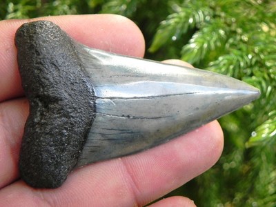 The Extinct Mako shark lived in the miocene era approximately 12 million years ago. Mako grew up to 30 feet long and had a deadly arsenal of 147 razor sharp teeth. There have been teeth found that exceed 3" long ! The formula for figuring length of the shark is done by the primary tooth measurements . Standard Measurements are taken from thetip to the longest root side. For every eighth of an inch equals 1 foot in length. There fore a 3" tooth would be 26' long. The Mako fed on squid, large fish, even aquatic mammals. The power of its jaws was incredible. They could slash through vertabrae and rib bones with ease. They could even slice through their own teeth teeth!