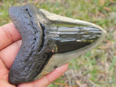 The megalodon shark lived in the miocene/ pliocene era approximately 12 million years ago. Megalodon grew up to 60 feet long and had a deadly arsenal of 147 razor sharp teeth. There have been teeth found that exceed 7" long ! The formula for figuring length of the shark is done by the primary tooth measurements . Standard Measurements are taken from thetip to the longest root side. For every eighth of an inch equals 1 foot in length. There fore a 7" tooth would be 56' long. The megalodon fed on whales squid,large fish and anything that moved. The power of its jaws was incredible. They could slash through vertabrae and rib bones with ease. They could even slice through their own teeth teeth!