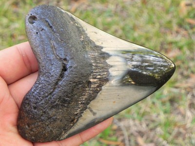 The megalodon shark lived in the miocene/ pliocene era approximately 12 million years ago. Megalodon grew up to 60 feet long and had a deadly arsenal of 147 razor sharp teeth. There have been teeth found that exceed 7" long ! The formula for figuring length of the shark is done by the primary tooth measurements . Standard Measurements are taken from thetip to the longest root side. For every eighth of an inch equals 1 foot in length. There fore a 7" tooth would be 56' long. The megalodon fed on whales squid,large fish and anything that moved. The power of its jaws was incredible. They could slash through vertabrae and rib bones with ease. They could even slice through their own teeth teeth!