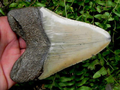 The megalodon shark lived in the Miocene/ Pliocene era approximately 12 million years ago. Megalodon grew up to 60 feet long and had a deadly arsenal of 147 razor sharp teeth. There have been teeth found that exceed 7" long ! The formula for figuring length of the shark is done by the primary tooth measurements . Standard Measurements are taken from the tip to the longest root side. For every eighth of an inch equals 1 foot in length. There fore a 7" tooth would be 56' long. The megalodon fed on whales squid,large fish and anything that moved. The power of its jaws was incredible. They could slash through vertebrae and rib bones with ease. They could even slice through their own teeth teeth!