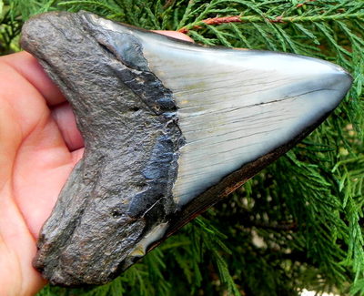 The megalodon shark lived in the miocene/ pliocene era approximately 12 million years ago. Megalodon grew up to 60 feet long and had a deadly arsenal of 147 razor sharp teeth. There have been teeth found that exceed 7" long ! The formula for figuring length of the shark is done by the primary tooth measurements . Standard Measurements are taken from the tip to the longest root side. For every eighth of an inch equals 1 foot in length. There fore a 7" tooth would be 56' long. The megalodon fed on whales squid,large fish and anything that moved. The power of its jaws was incredible. They could slash through vertebrae and rib bones with ease. They could even slice through their own teeth teeth!