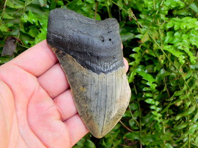The megalodon shark lived in the Miocene/Pliocene era approximately 12 million years ago. Megalodon grew up to 60 feet long and had a deadly arsenal of 147 razor sharp teeth. There have been teeth found that exceed 7" long ! The formula for figuring length of the shark is done by the primary tooth measurements . Standard Measurements are taken from the tip to the longest root side. For every eighth of an inch equals 1 foot in length. There fore a 7" tooth would be 56' long. The megalodon fed on whales squid,large fish and anything that moved. The power of its jaws was incredible. They could slash through vertebrae and rib bones with ease. They could even slice through their own teeth teeth!