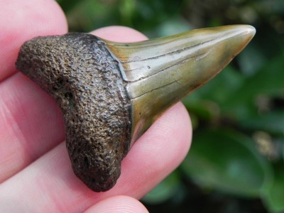 The Extinct Mako shark lived in the miocene era approximately 12 million years ago. Mako grew up to 30 feet long and had a deadly arsenal of 147 razor sharp teeth. There have been teeth found that exceed 3" long ! The formula for figuring length of the shark is done by the primary tooth measurements . Standard Measurements are taken from thetip to the longest root side. For every eighth of an inch equals 1 foot in length. There fore a 3" tooth would be 26' long. The Mako fed on squid, large fish, even aquatic mammals. The power of its jaws was incredible. They could slash through vertabrae and rib bones with ease. They could even slice through their own teeth teeth!