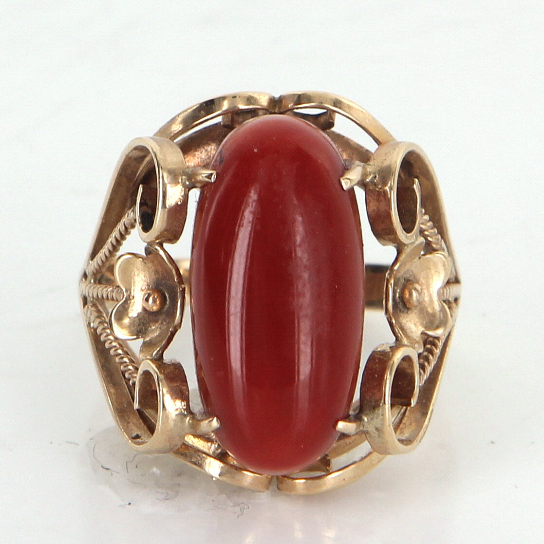 Centrally mounted cabochon cut Mediterranean red coral measures 16.5mm x 7.5mm (estimated at 3.50 carats). Note: natural color variance to the coral along with several fissures (inherent to the stone).