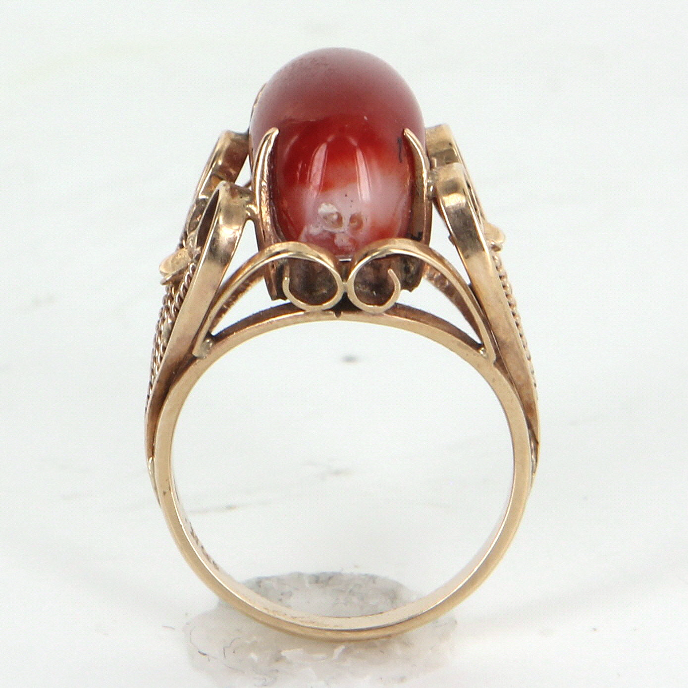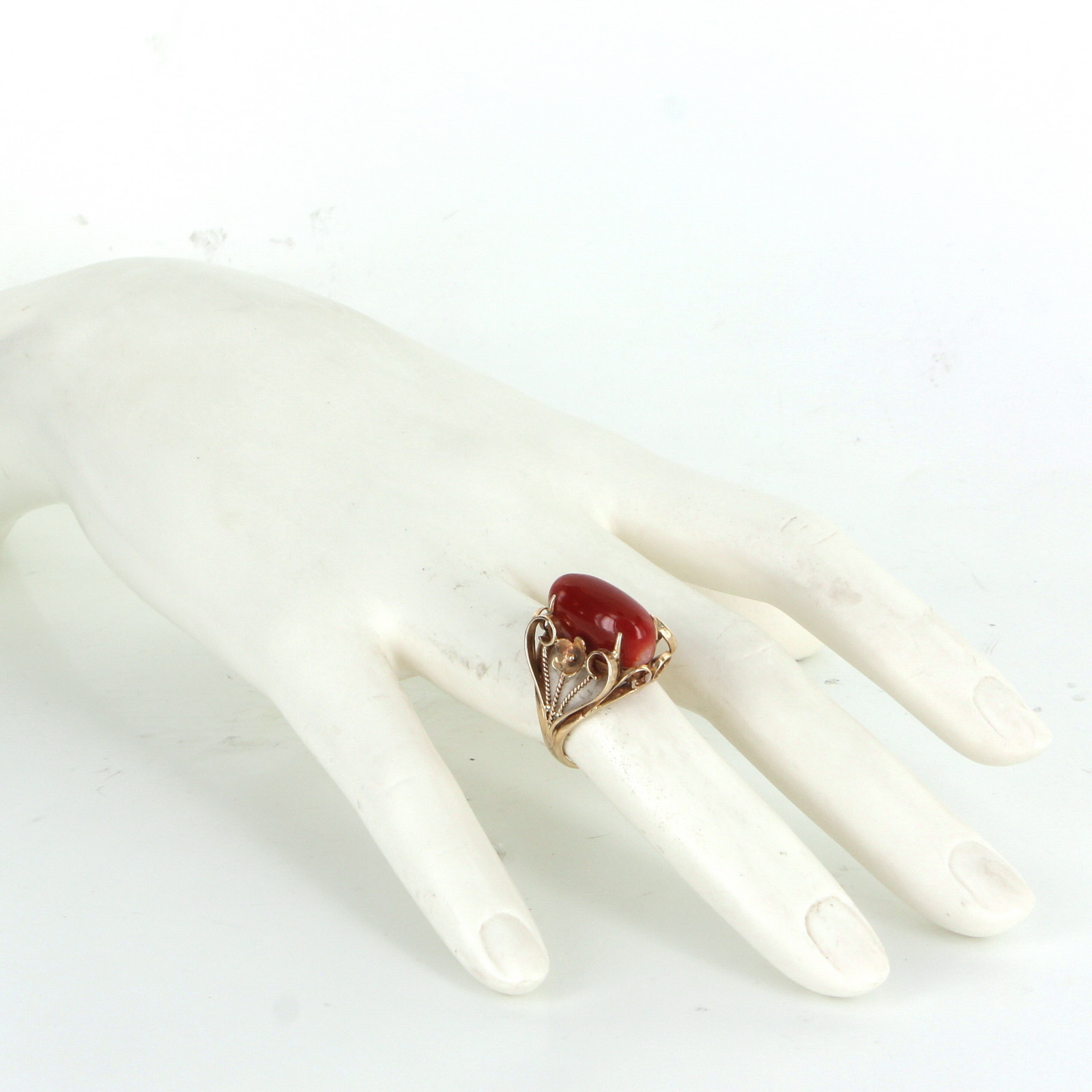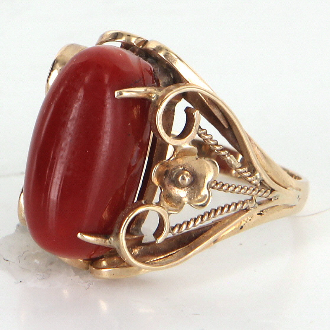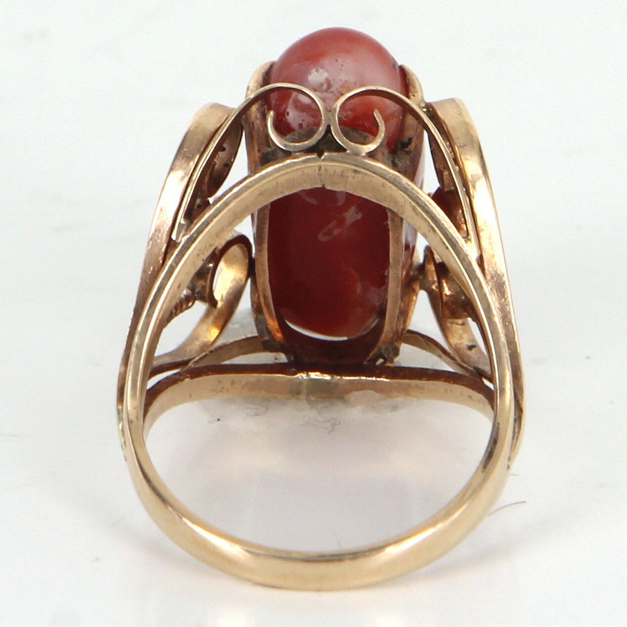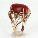 The ring is in excellent condition. Particulars: Weight: 5.9 grams Stones: Centrally mounted cabochon cut Mediterranean red coral measures 16.5mm x 7.5mm (estimated at 3.50 carats). Note: natural color variance to the coral along with several fissures (inherent to the stone).