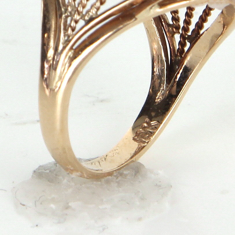 Size & Measurements: The ring is a size 5 3/4 (sizable). The mount measures 19mm in length (0.74 inches) and 15mm wide (0.59 inches), rising 11mm from the finger. Metal & Hallmark: Solid 18 karat yellow gold. The ring is hallmarked "18k".