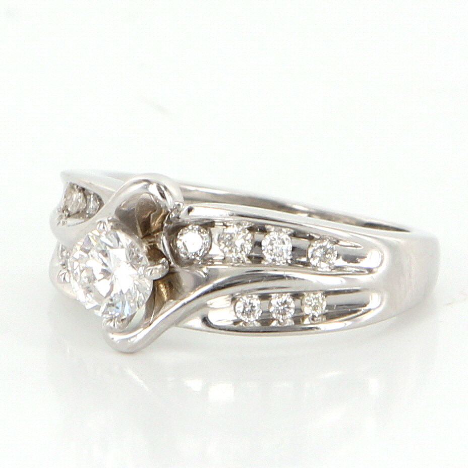 Round brilliant cut diamonds totaling an estimated .68 carat make a lovely statement. The estate ring is in excellent condition. Particulars: Weight: 4.2 grams Stones: 14 approx. .02 carat estimated round brilliant cut diamonds totaling .28 carat (sides) and 1 approx. .40 carat estimated round brilliant cut diamond. The total diamond weight is estimated .68 carat (estimated H-I in color and SI1 in clarity).