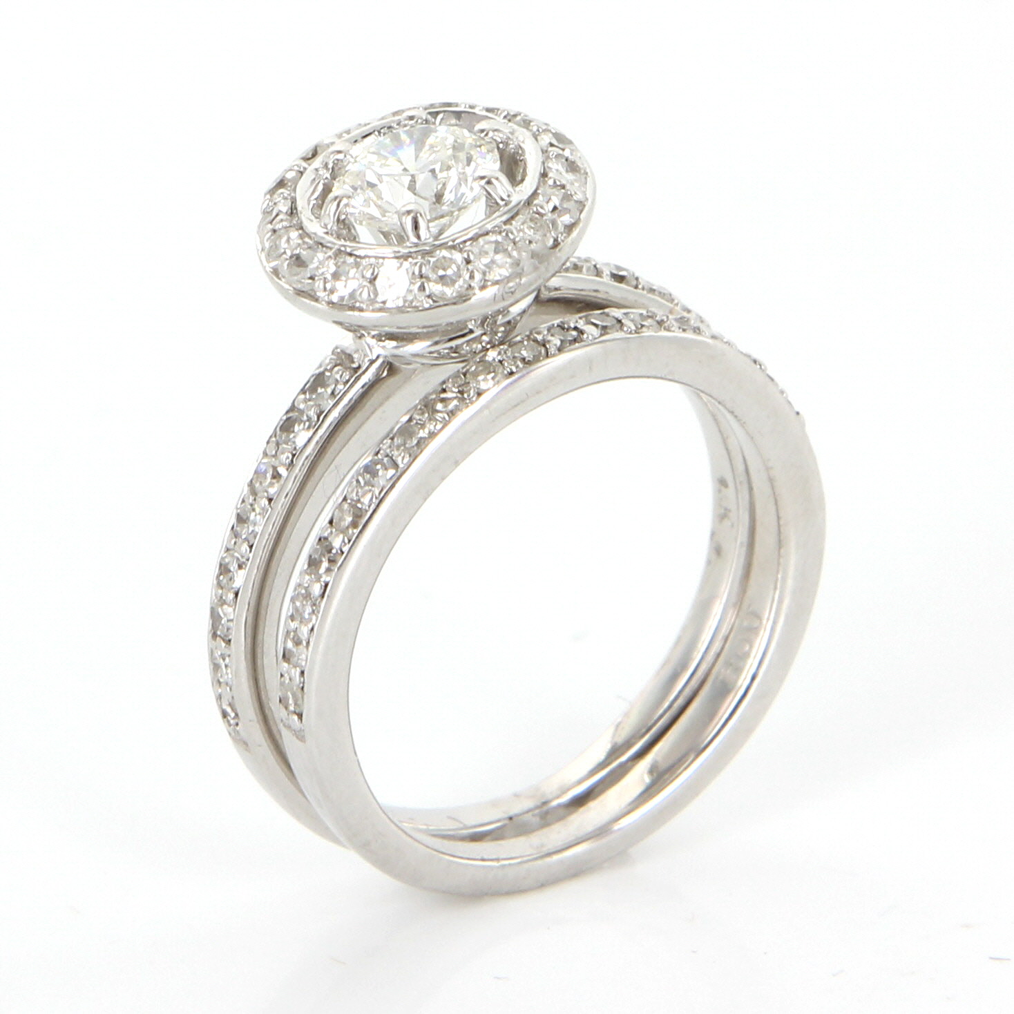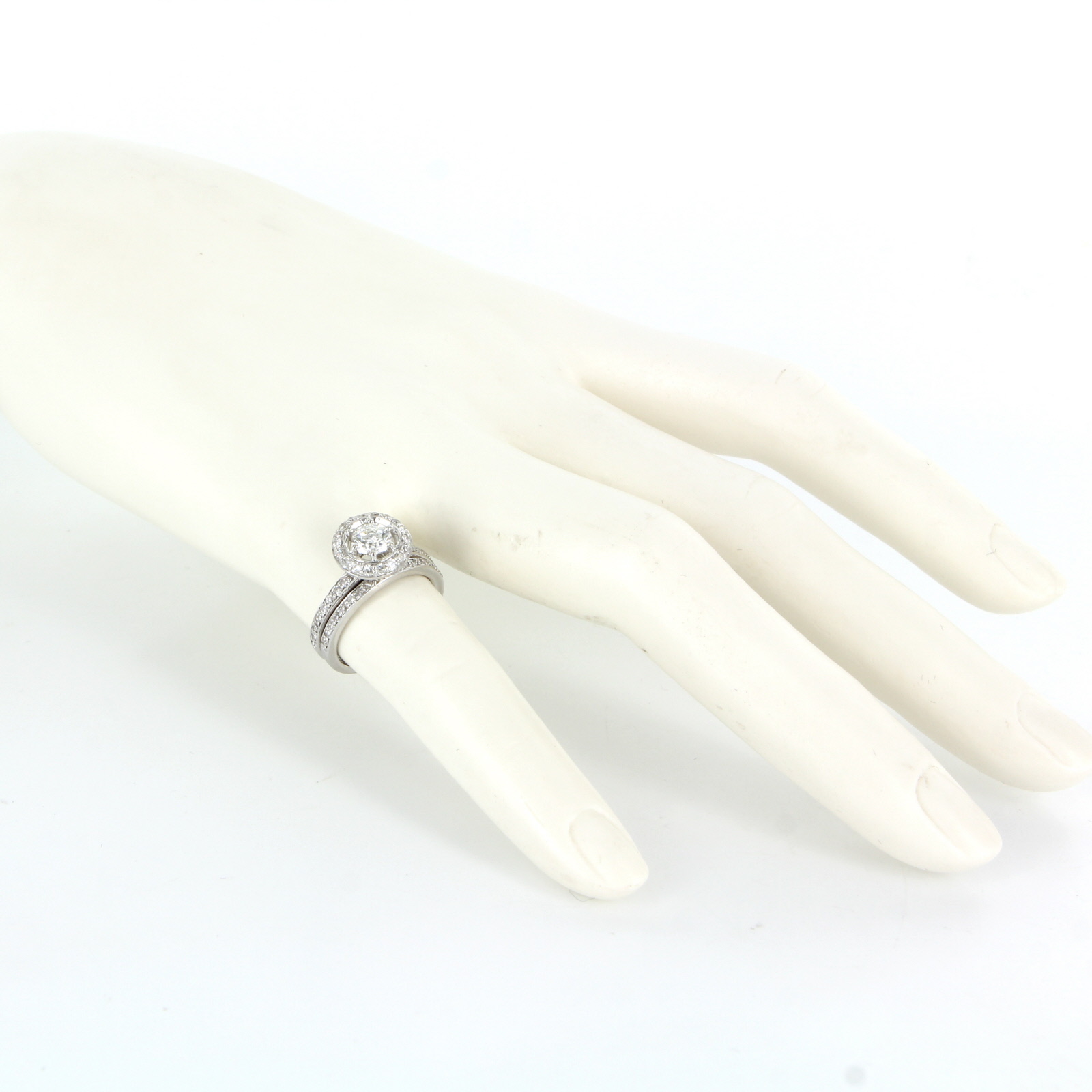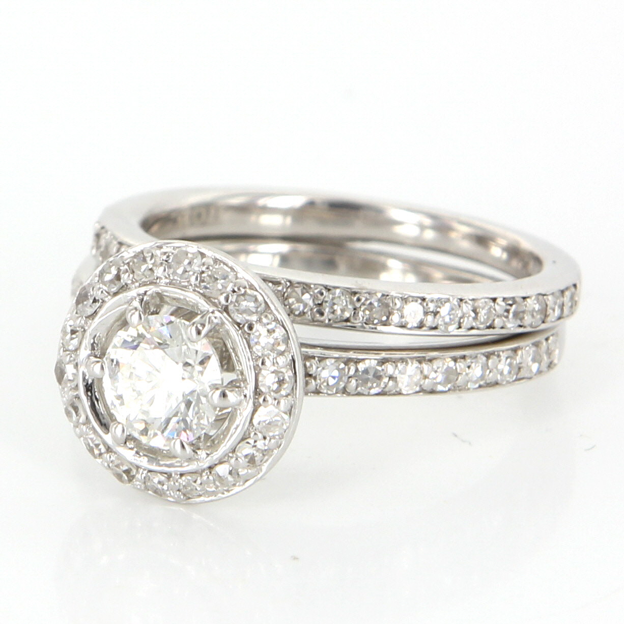 The halo mount features an estimated .45 carat round brilliant cut diamond (center) and estimated .55 carat single cut diamonds are set into the bands. Diamond weight totaling 1 carat.