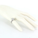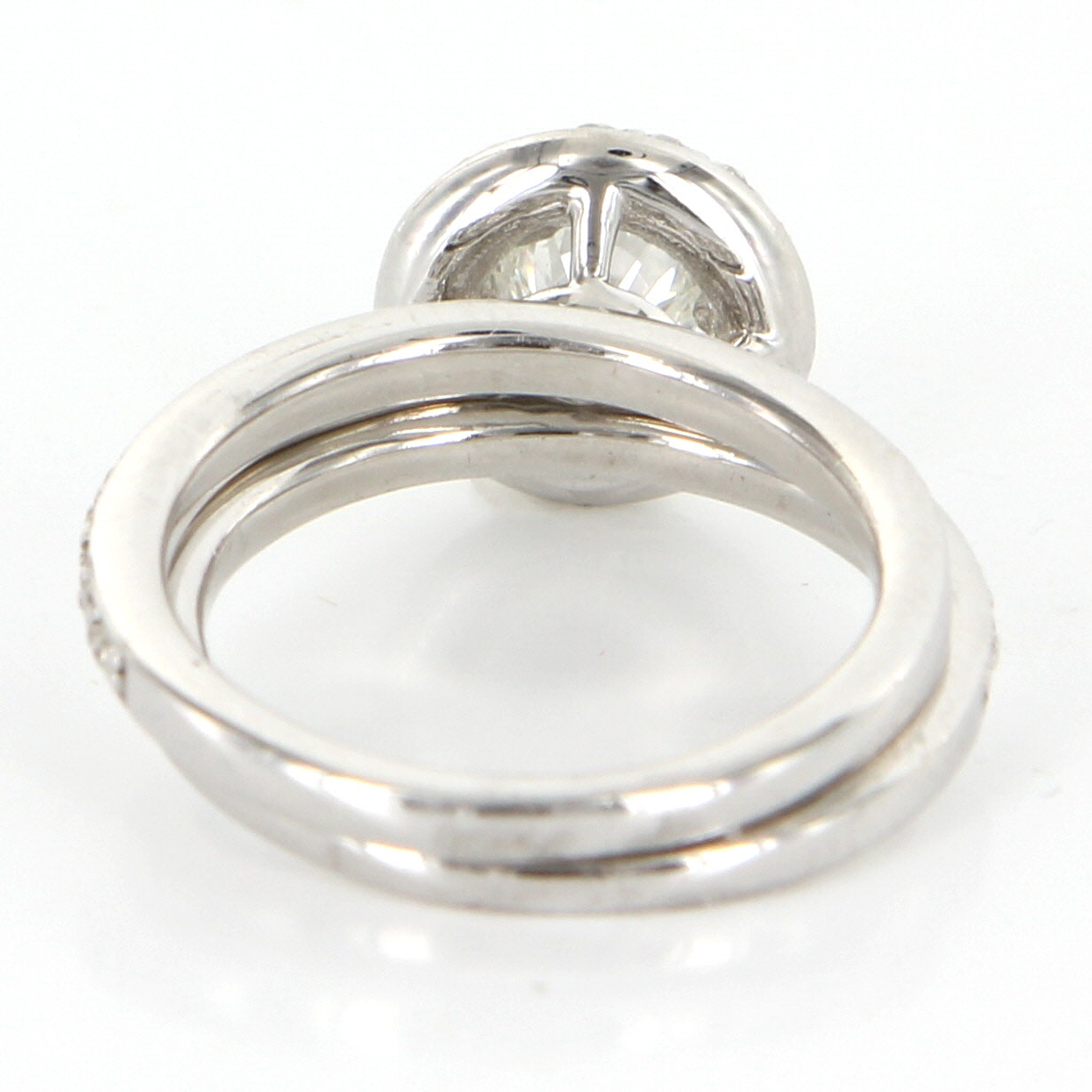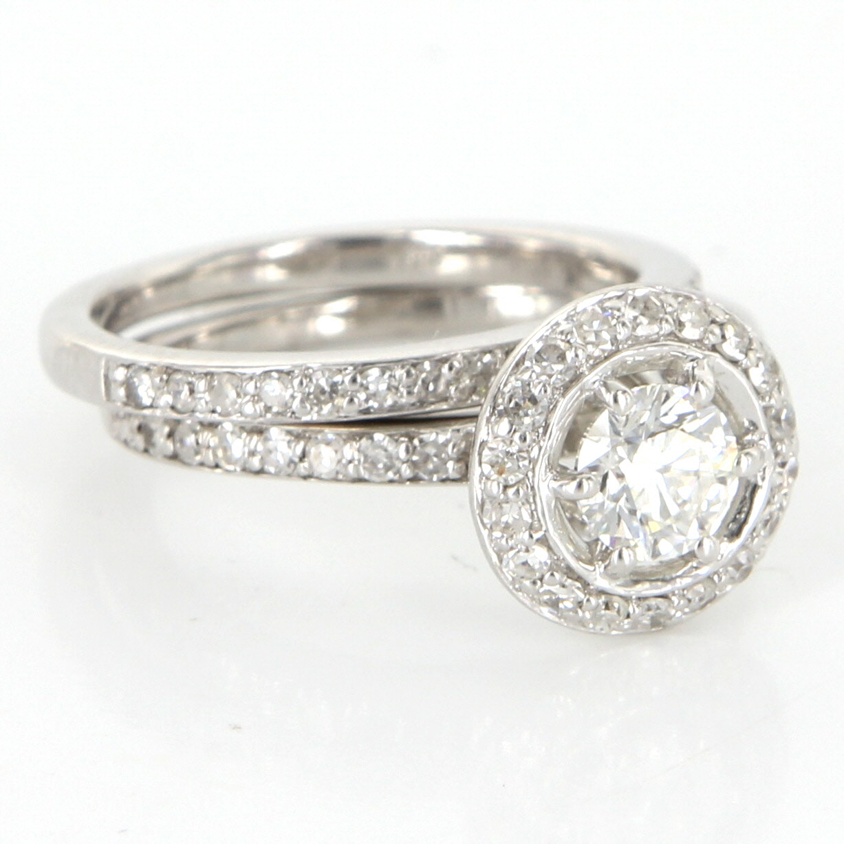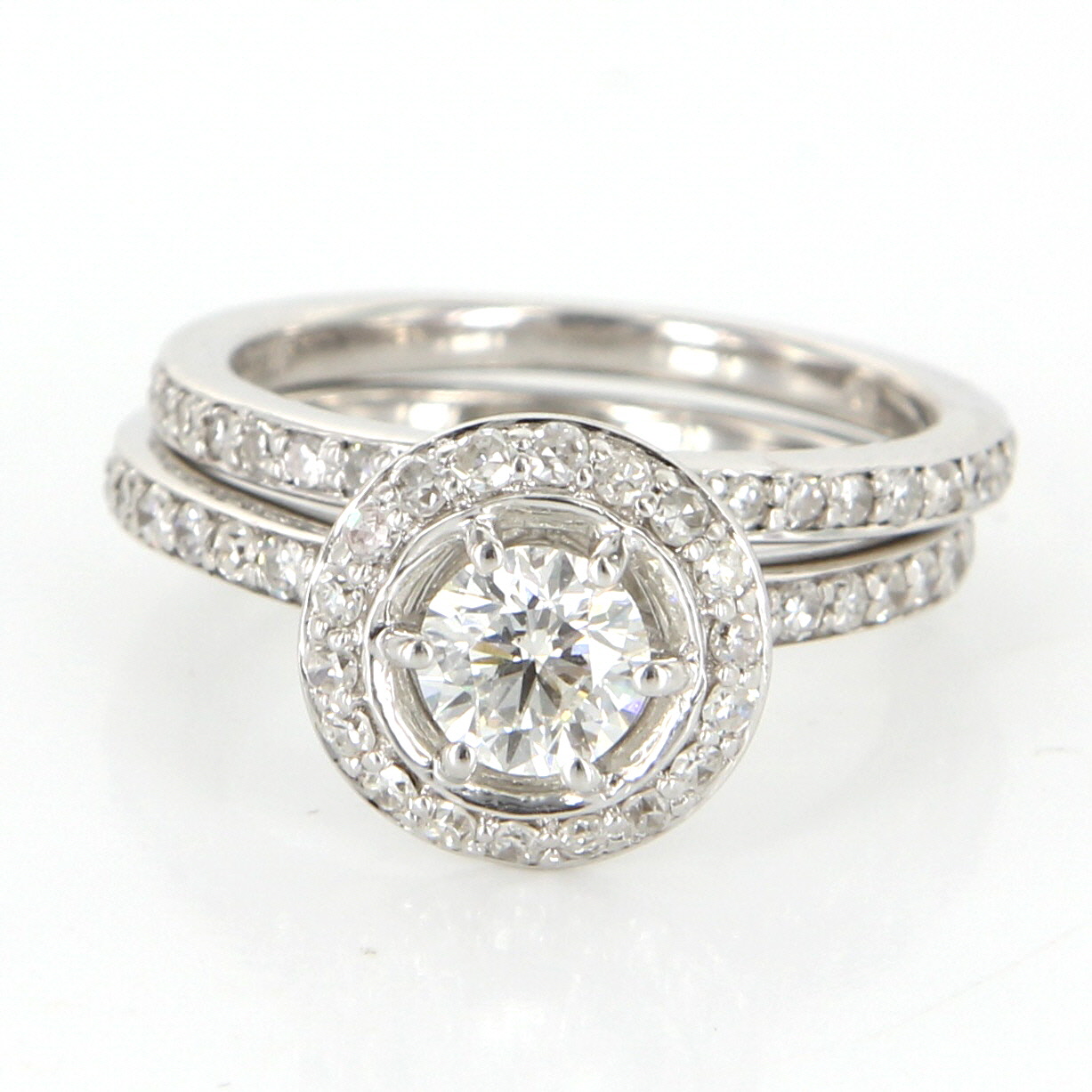The halo mount features an estimated .45 carat round brilliant cut diamond (center) and estimated .55 carat single cut diamonds are set into the bands. Diamond weight totaling 1 carat.