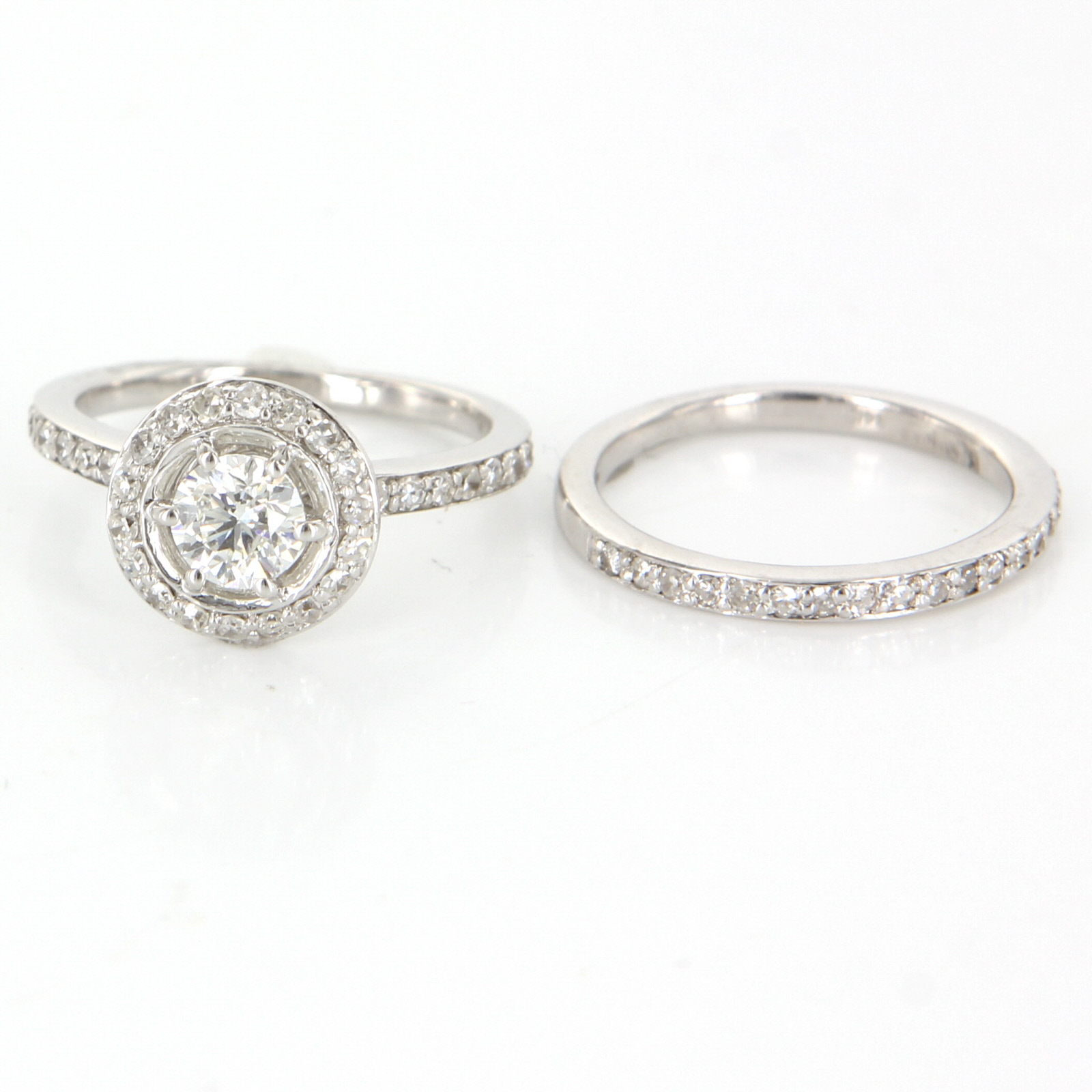 Particulars: Weight: 5 grams Stones: 1 approx. .45 carat estimated round brilliant cut diamond (center) and 55 approx. .01 carat estimated single cut diamonds totaling an estimated .55 carat. The total diamond weight is estimated 1 carat (estimated at G-H in color and SI2-I1 in clarity). Size & Measurements: The rings are a size 4 1/2 (sizable). The mount measures 9.6mm in width, rising 7.75mm from the finger. Metal & Hallmark: Solid 14 karat white gold. The rings are hallmarked "14k".