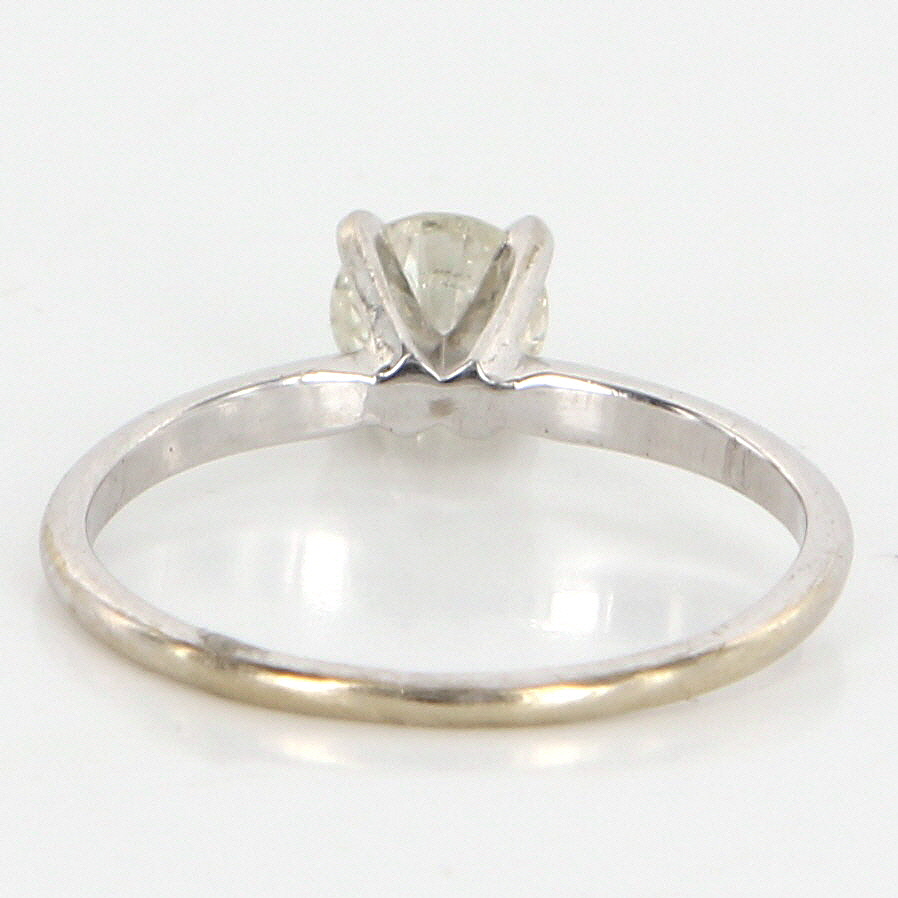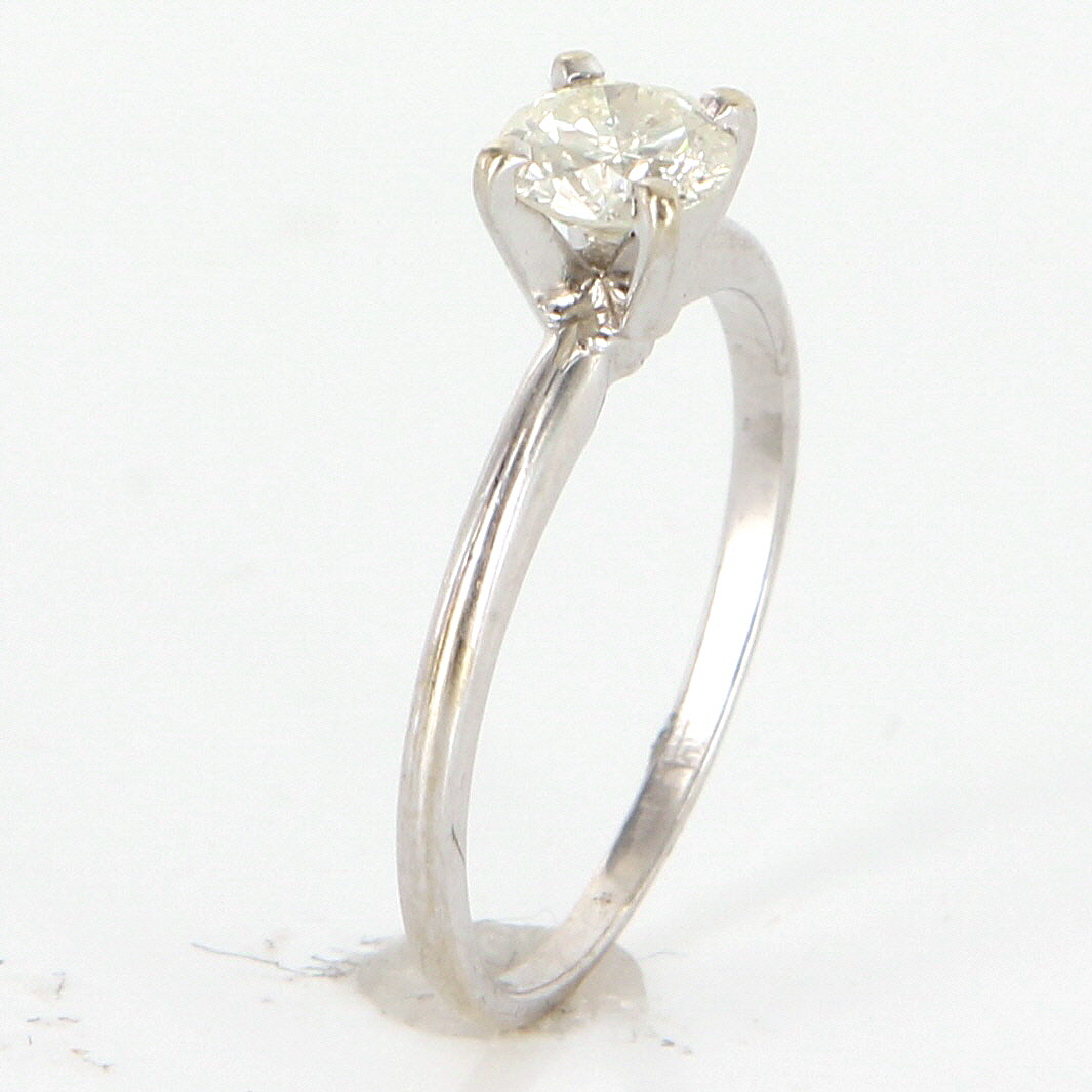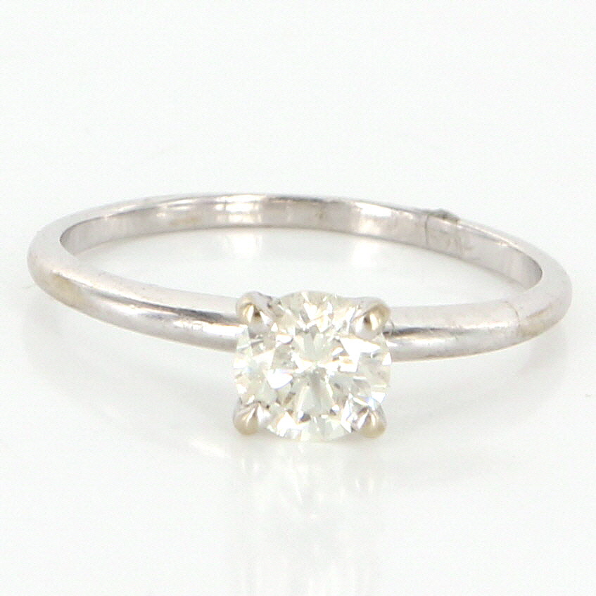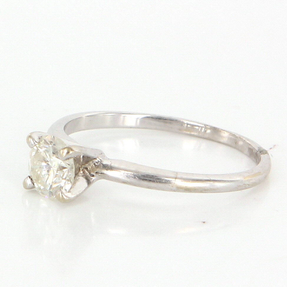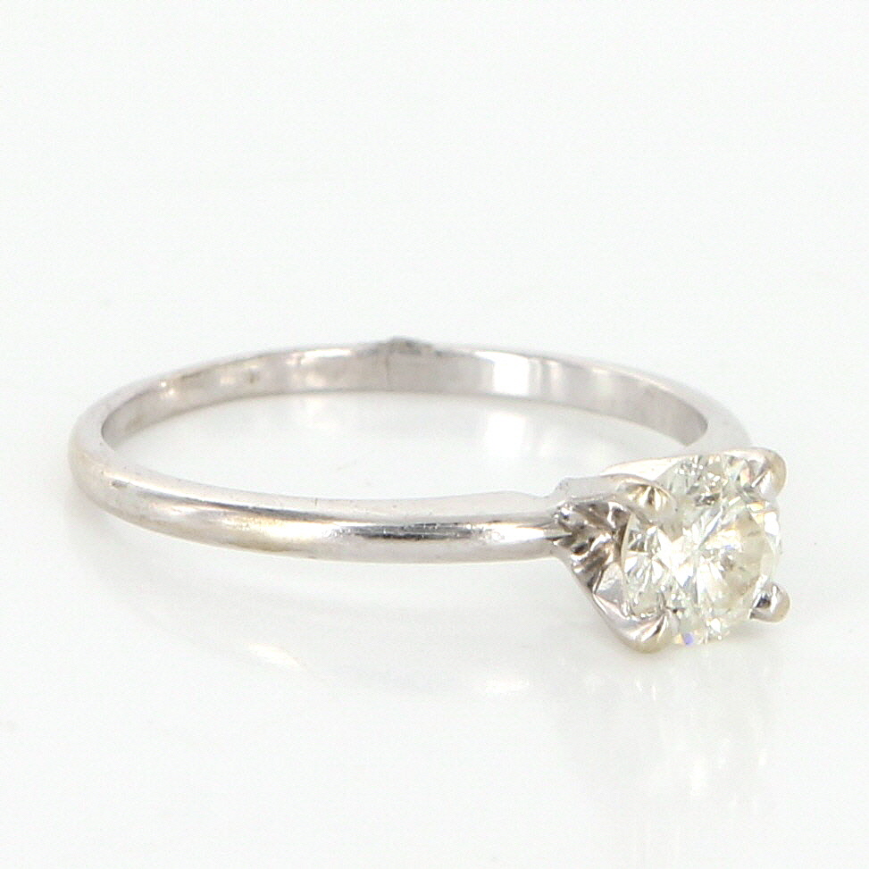 Vintage Engagement Ring Overview: Offered for sale is a truly superb vintage solitaire engagement ring, crafted beautifully in solid 14 karat white gold. A .45 carat estimated round brilliant cut diamond forms the centerpiece of this stunning solitaire ring. Vintage ring in excellent condition. Particulars: Weight: 1.4 grams Stones: One approx. .45 carat estimated round brilliant cut diamond (estimated H-I in color and SI2-3 in clarity). Size & Measurements: The ring is a size 5 (sizable). The mount measures 5mm in width and the ring rises 6mm from the finger. Metal & Hallmark: Solid 14 karat white gold. The ring is not hallmarked though has been tested positive for 14 karat gold. Additional Information: Your item will be securely packaged and presented in a lovely gift box. Should you have any questions about this item please feel free to email. Lot G3406