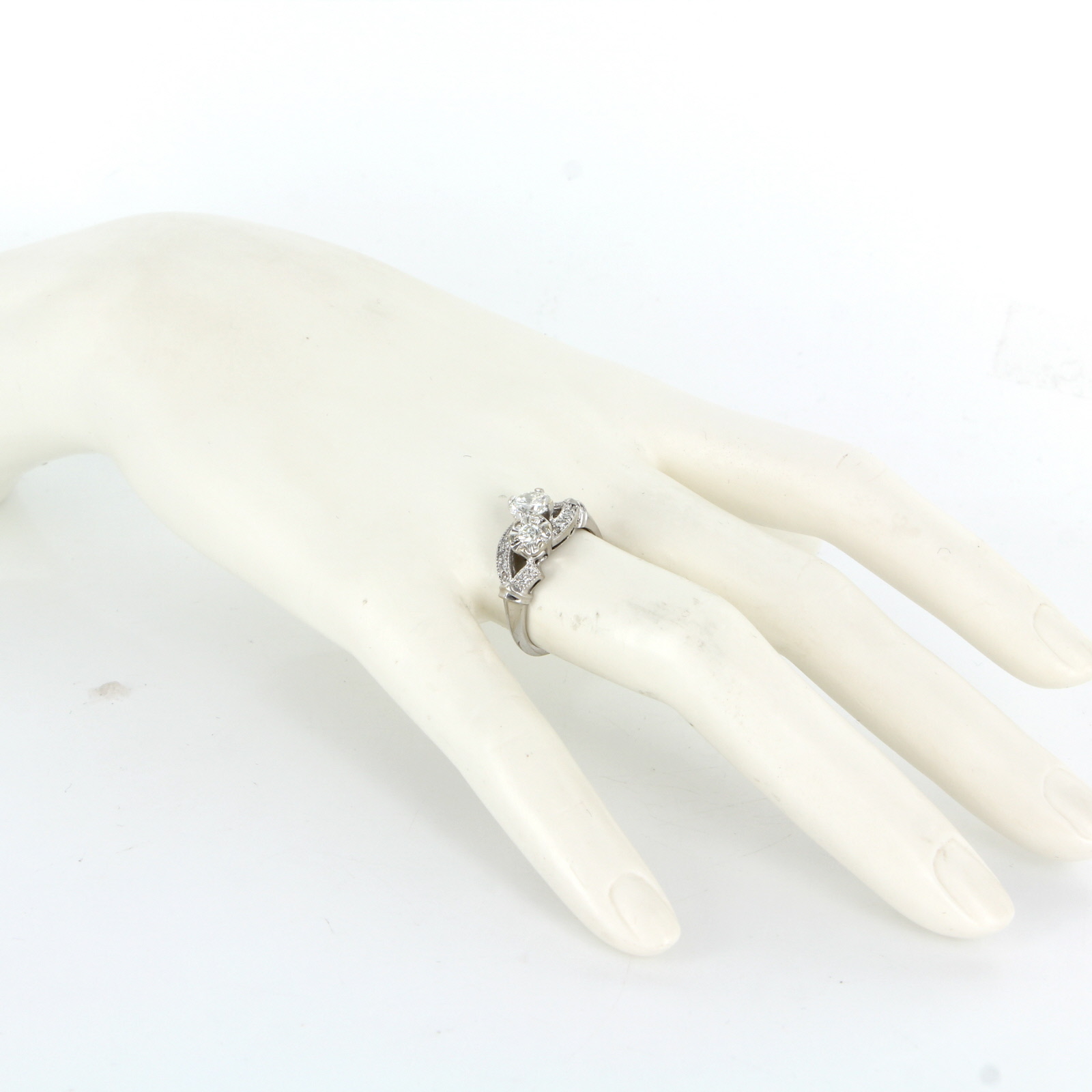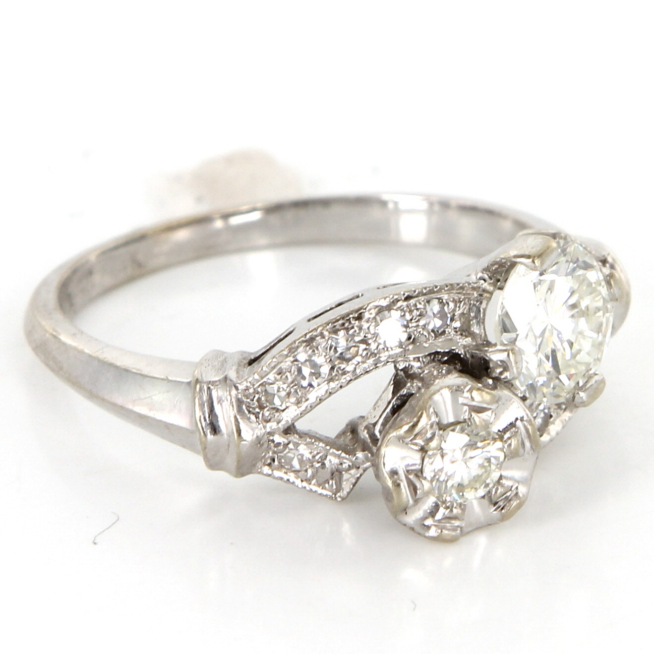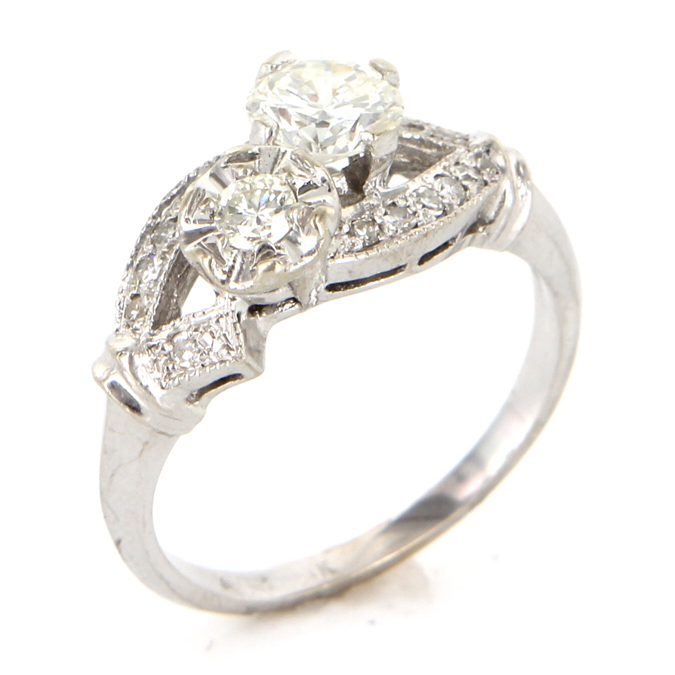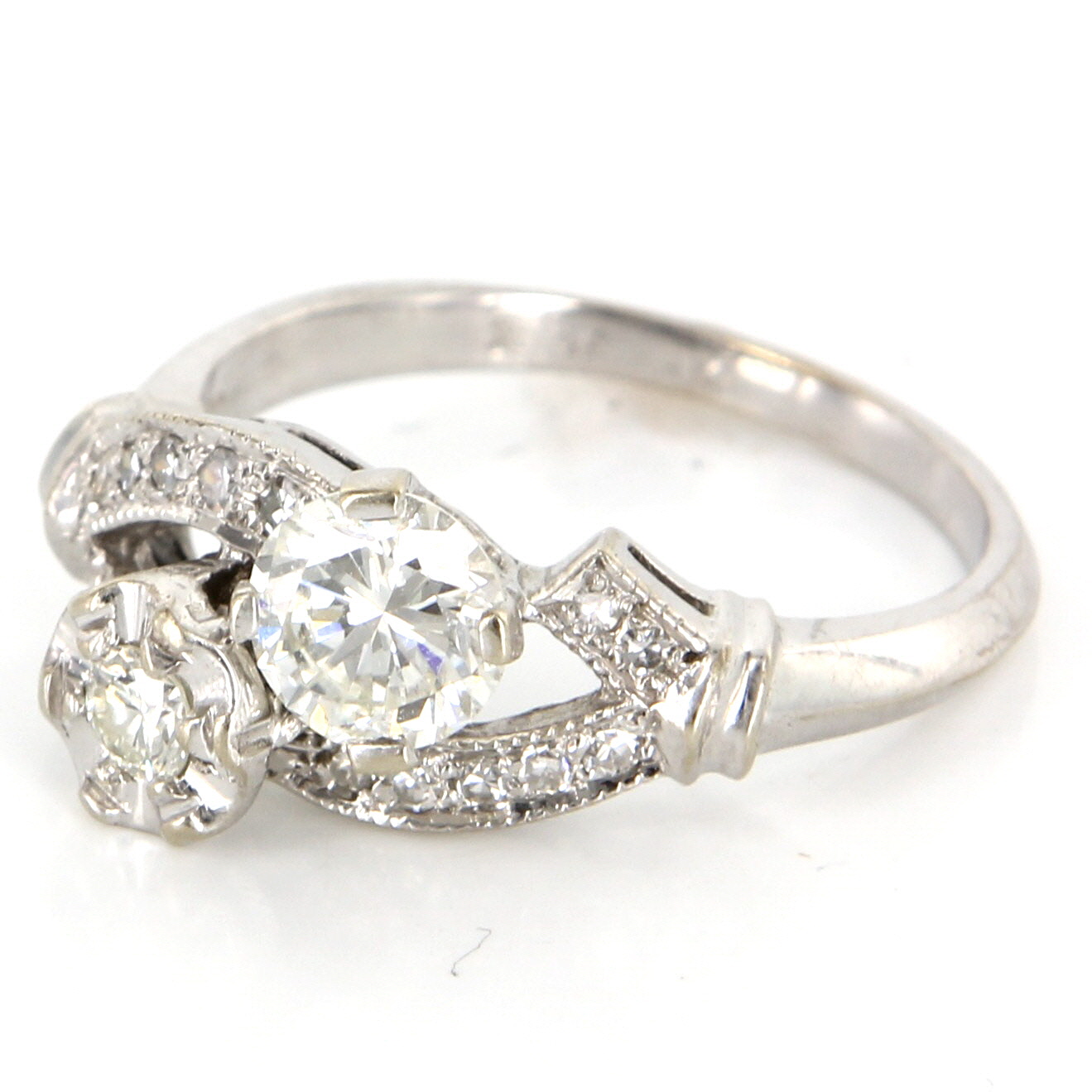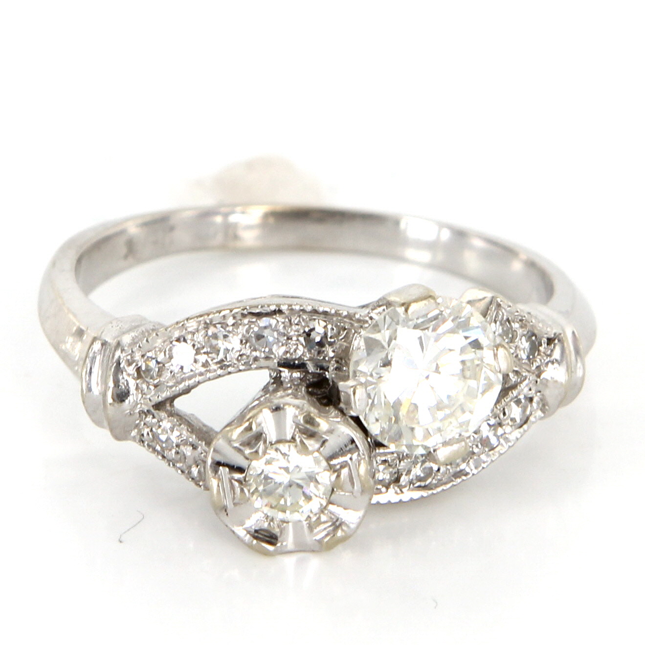 The double mount features round brilliant cut diamonds with different sizes. One diamond is estimated .60 carat and the other diamond is estimated .12 carat accented by single cut diamonds totaling an estimated .13 carat.