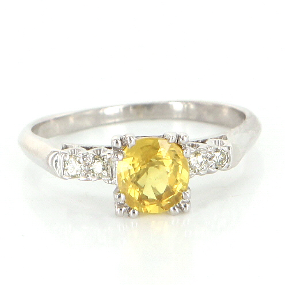 Centrally mounted yellow sapphire measuring 6.4mm diameter (estimated at 1.40 carats) and a total of 0.08 carats of diamonds (estimated at H-I color and SI1 clarity) The gemstones are in excellent condition and free of cracks or chips. The ring is in excellent original condition.