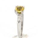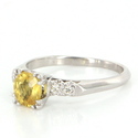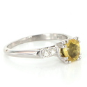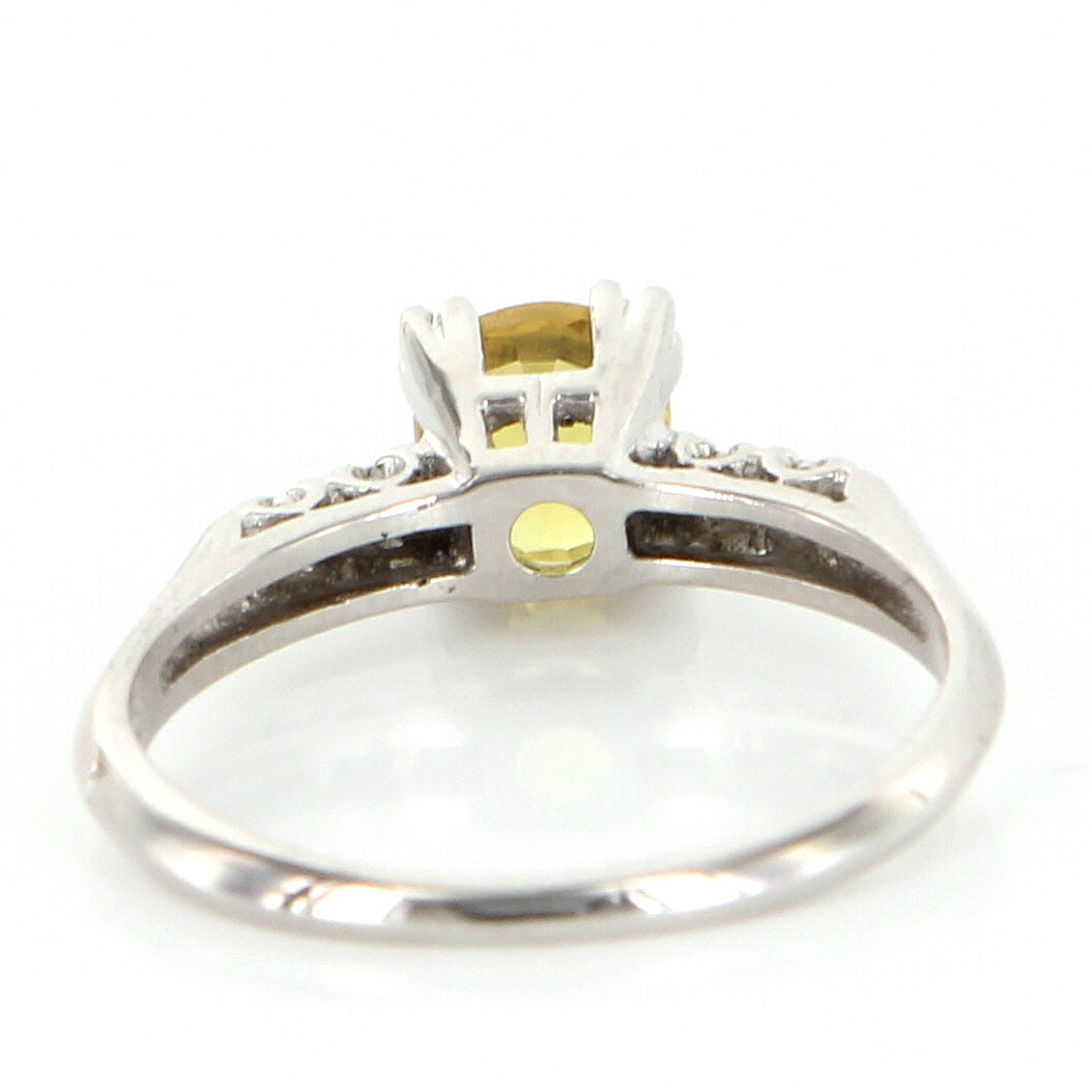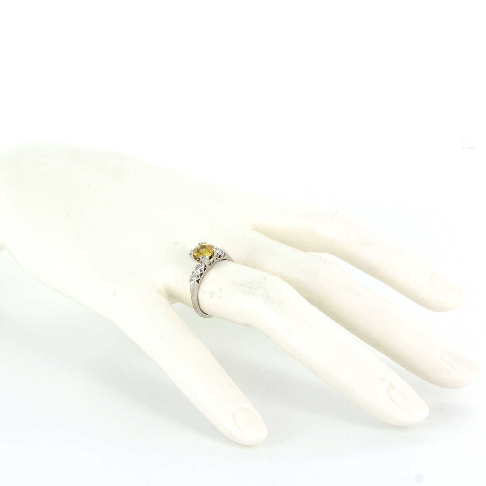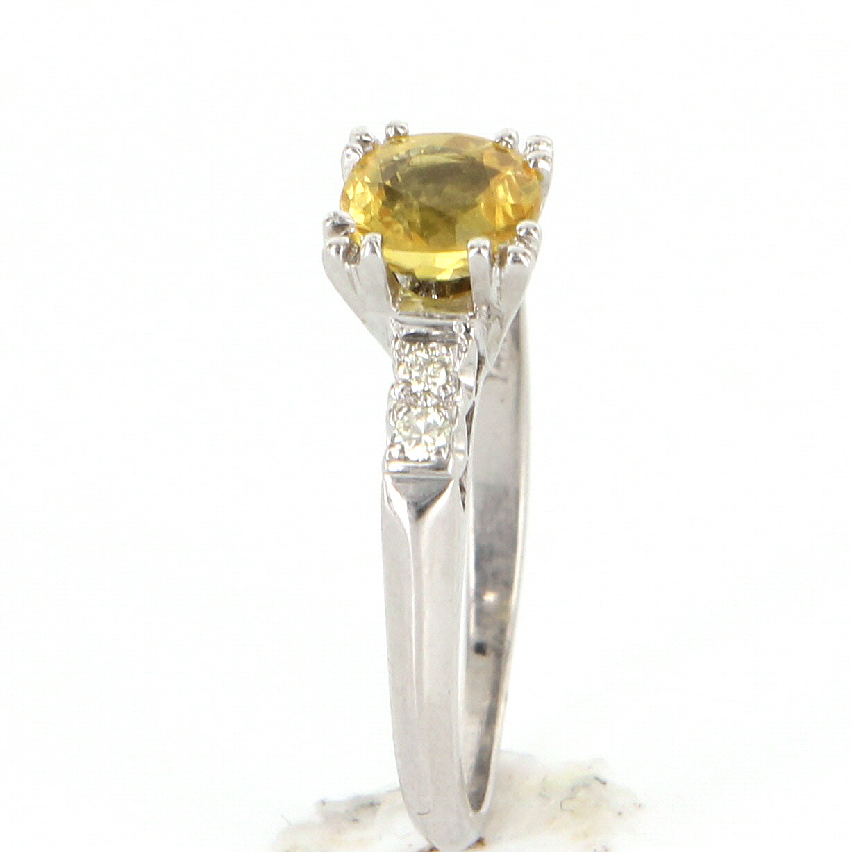 Particulars: Weight: 6.1 grams Stones: Centrally mounted yellow sapphire measuring 6.4mm diameter (estimated at 1.40 carats) and a total of 0.08 carats of diamonds (estimated at H-I color and SI1 clarity) The gemstones are in excellent condition and free of cracks or chips.