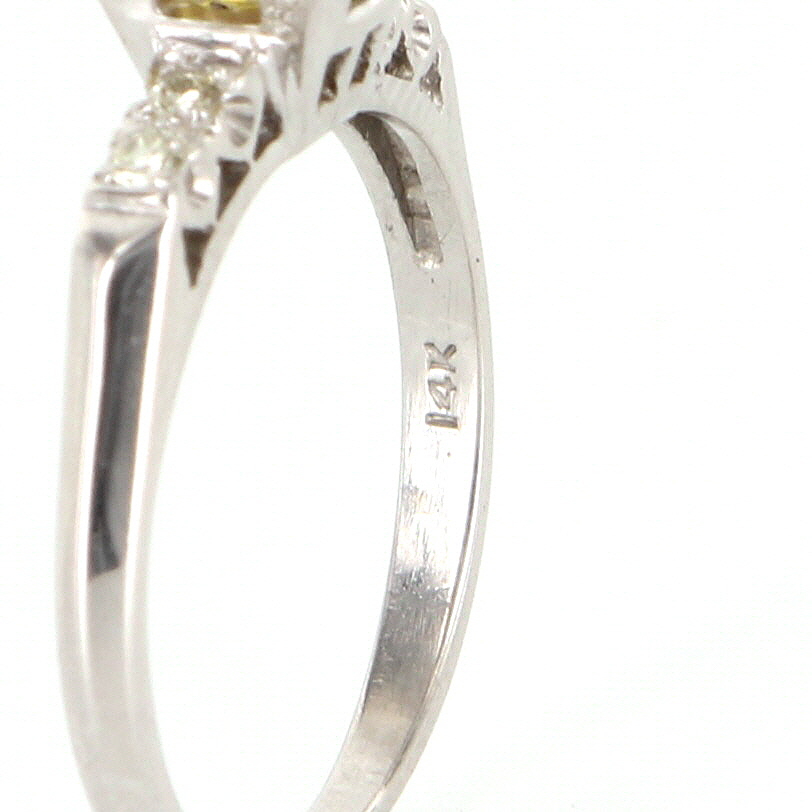 Size & Measurements: The ring is a size 7 1/4 (sizable). The mount measures 7mm diameter (0.27 inches), rising 7mm from the finger. Metal & Hallmark: Solid 14 karat white gold. The ring is hallmarked "14k".