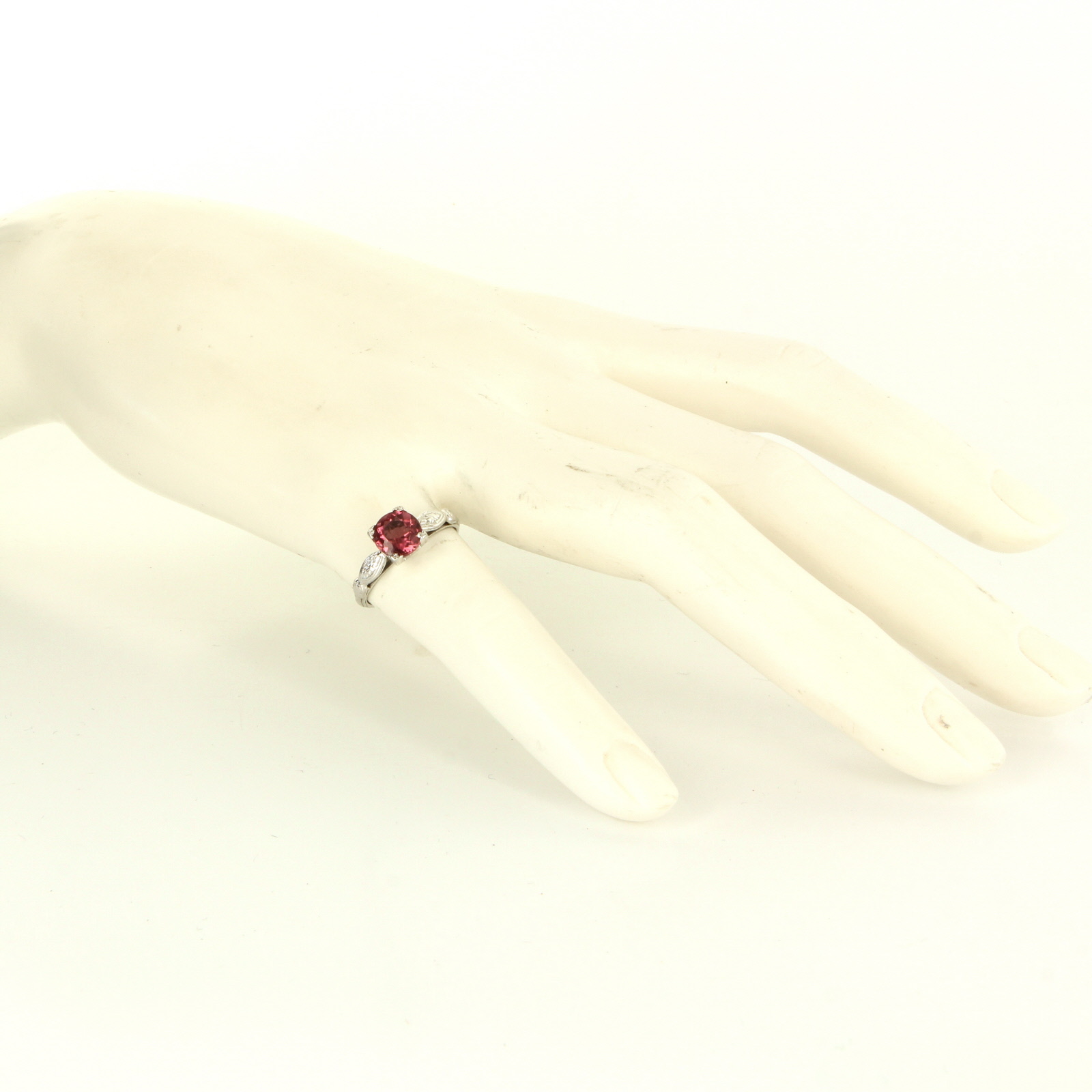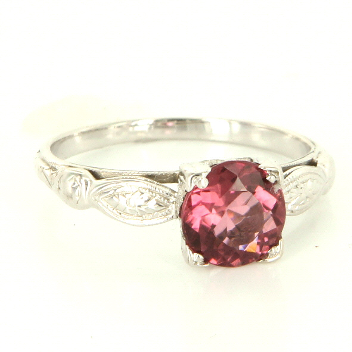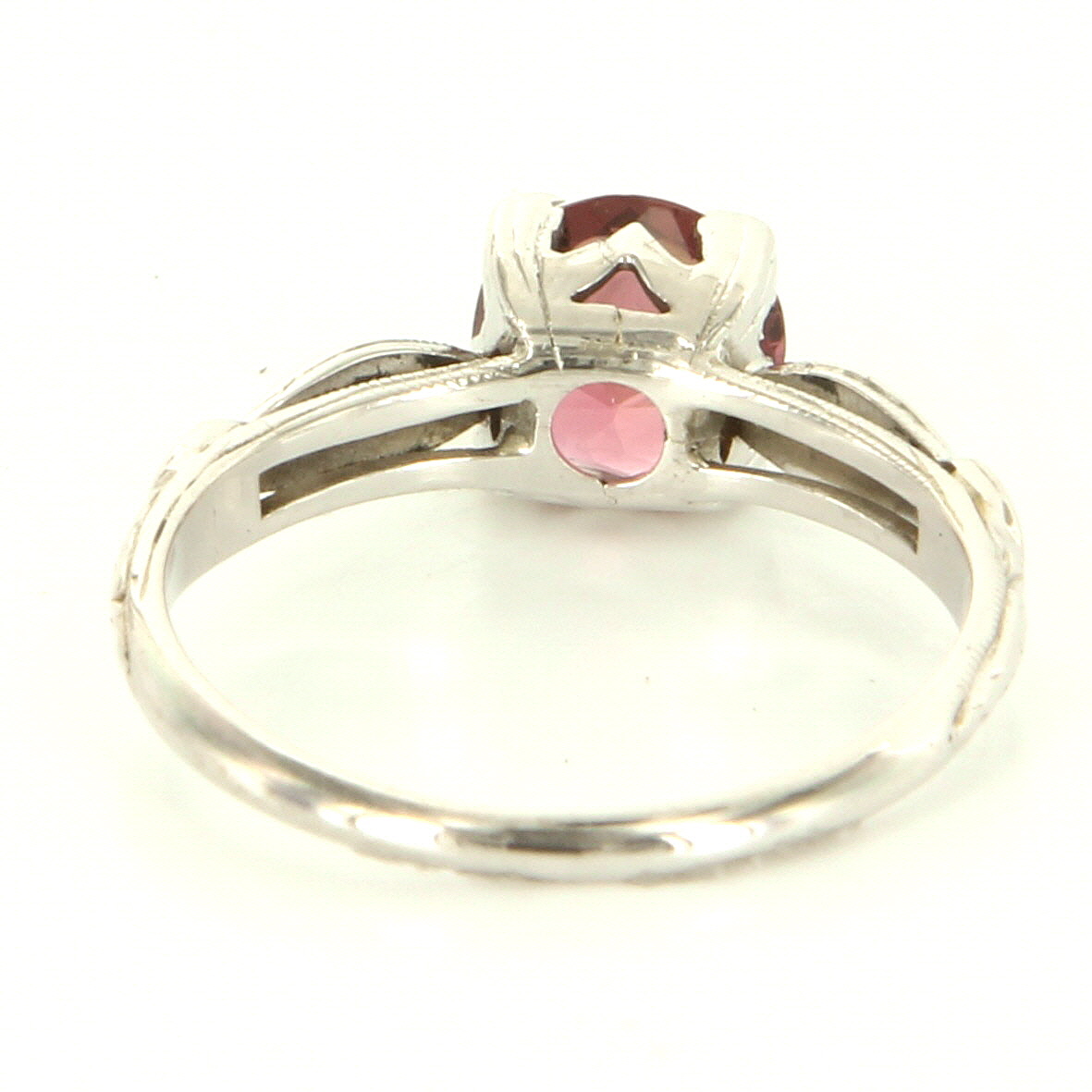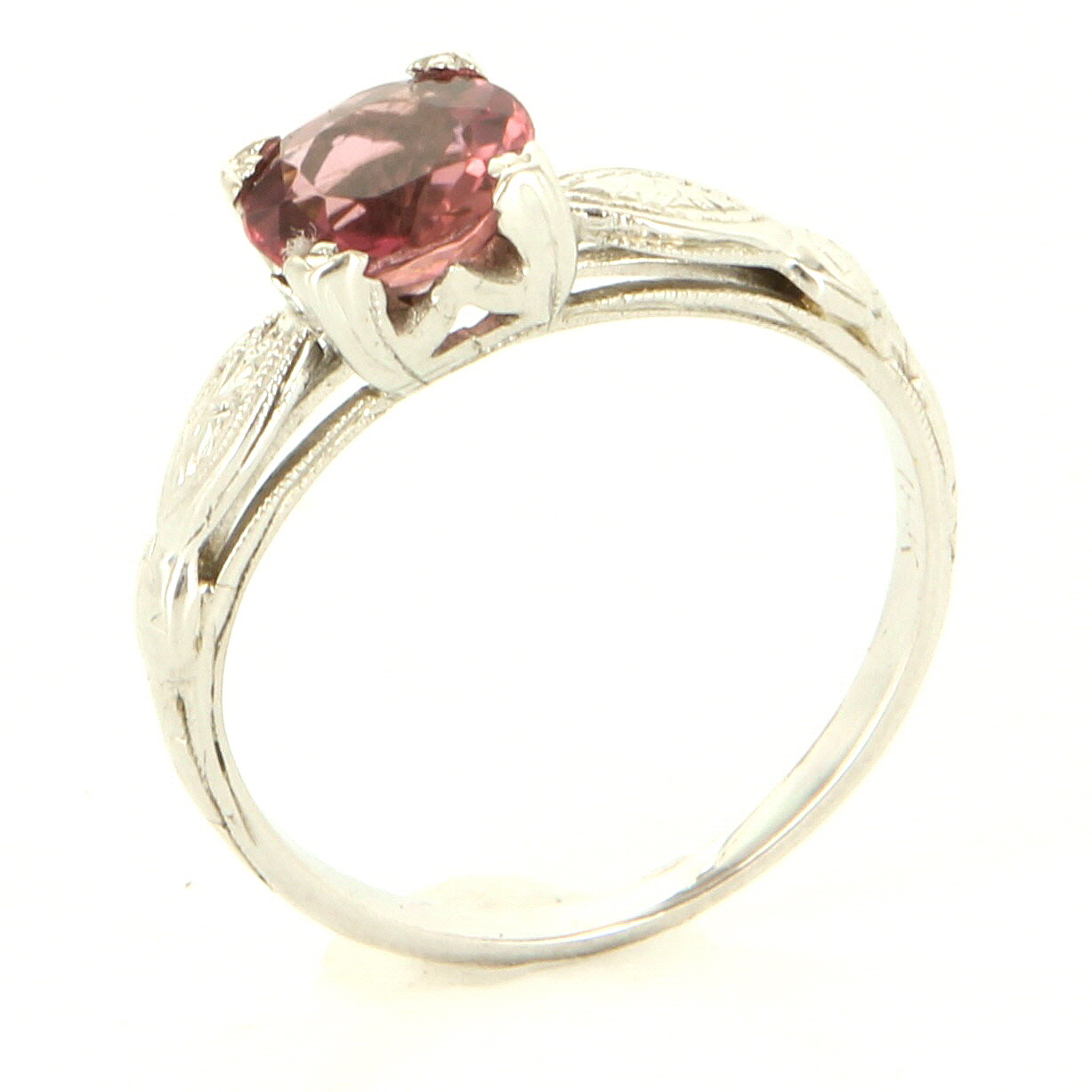 *The overall condition of the ring is very good. Particulars: Weight: 2.3 grams Stones: One pink tourmaline totaling 1 carat estimated. Size & Measurements: The ring is a size 5 (sizable). The mount measures 6mm in width, tapering down to 1.5mm (base of ring). Metal & Hallmark: Solid 18 karat white gold. The ring is hallmarked "18k".