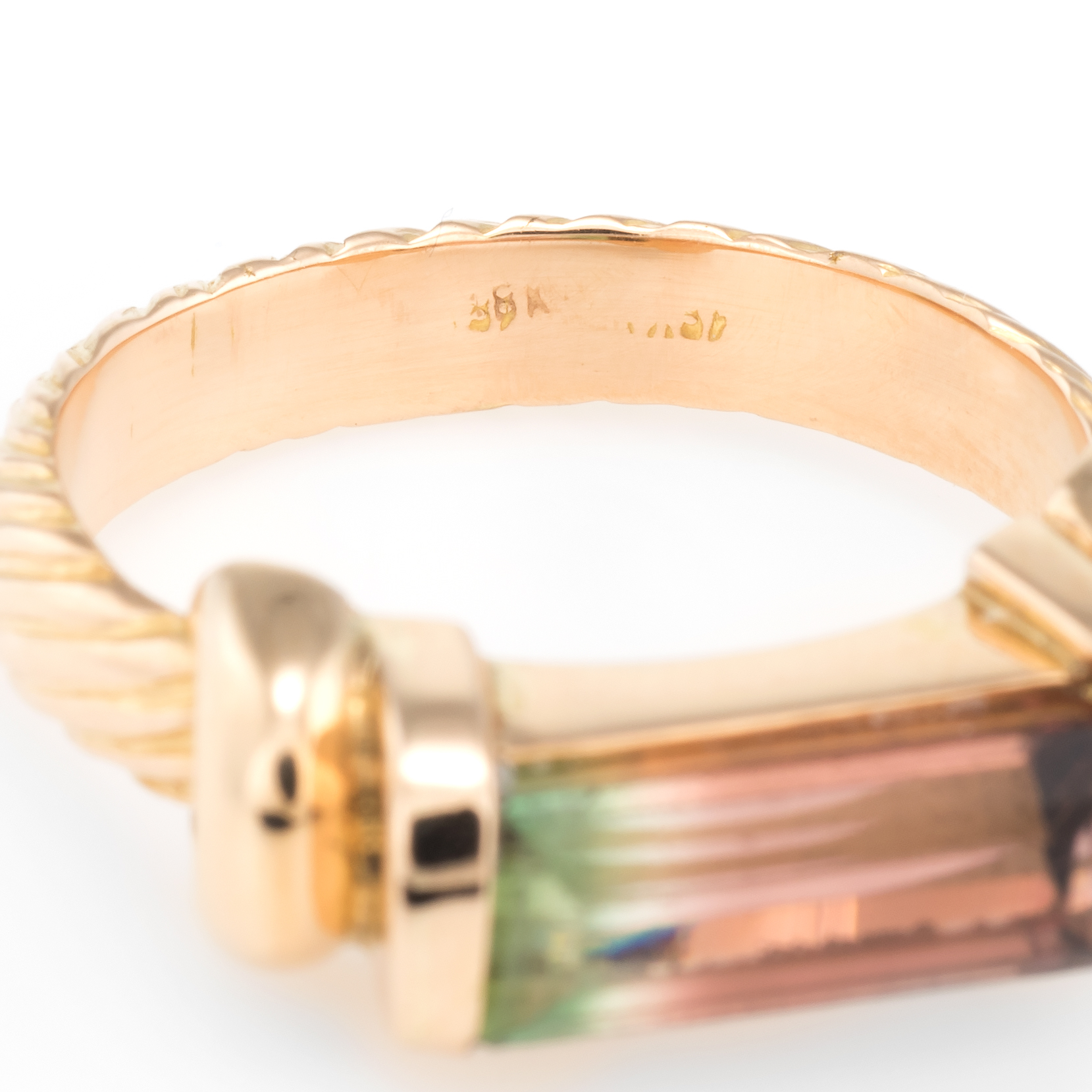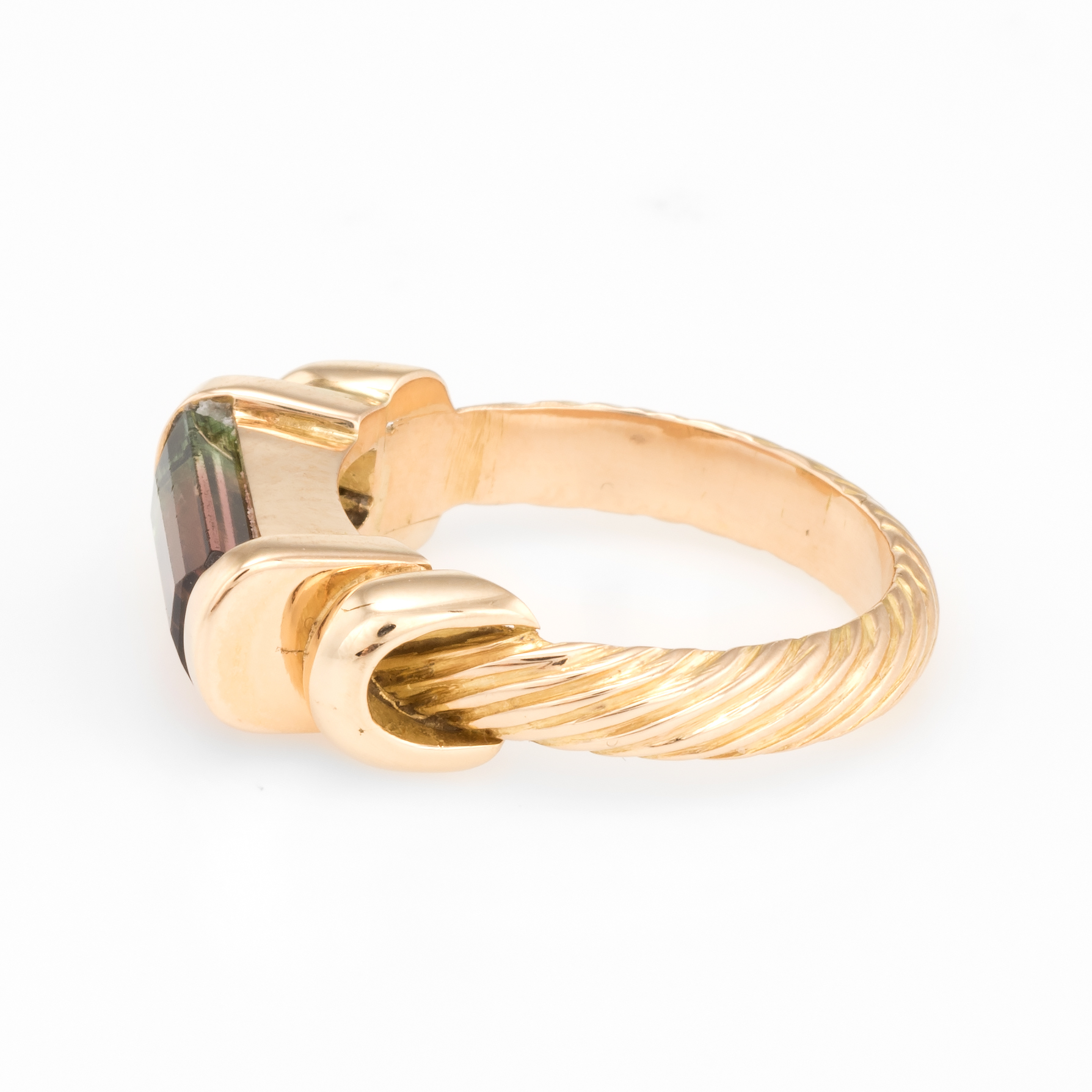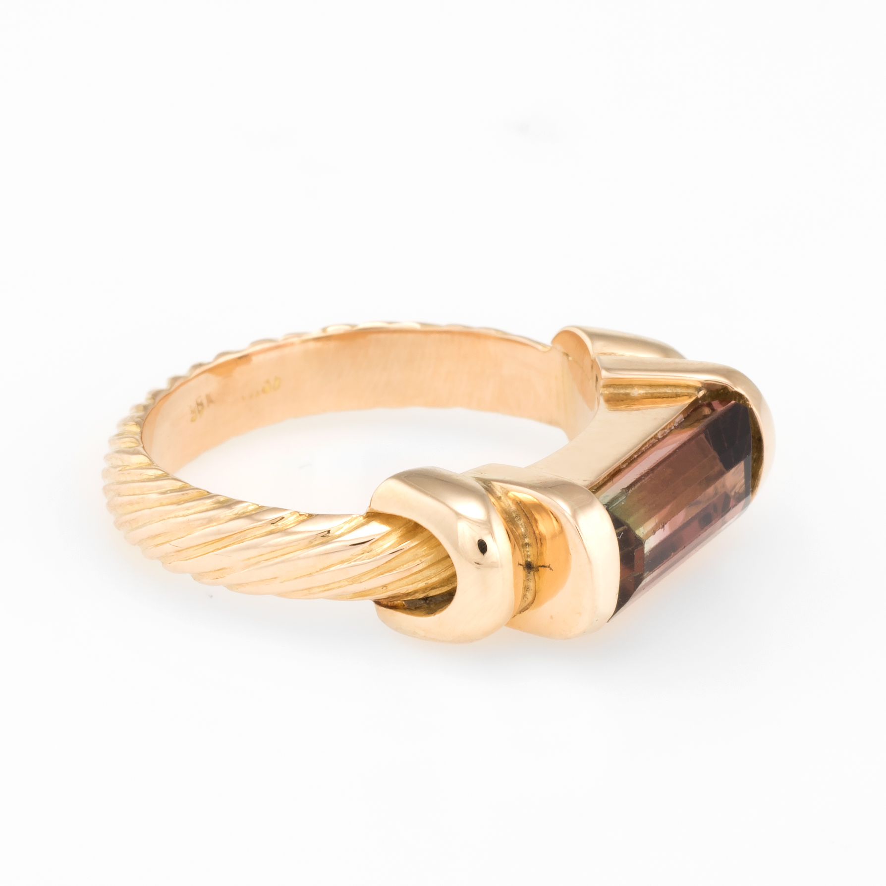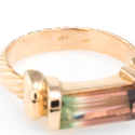 The ring is in excellent condition. Particulars: Weight: 5.4 grams Stones: Faceted watermelon tourmaline measures 11mm x 4.5mm. The tourmaline is in excellent condition and free of cracks or chips.
