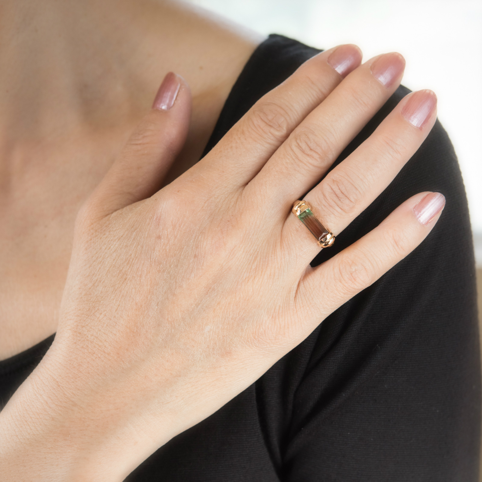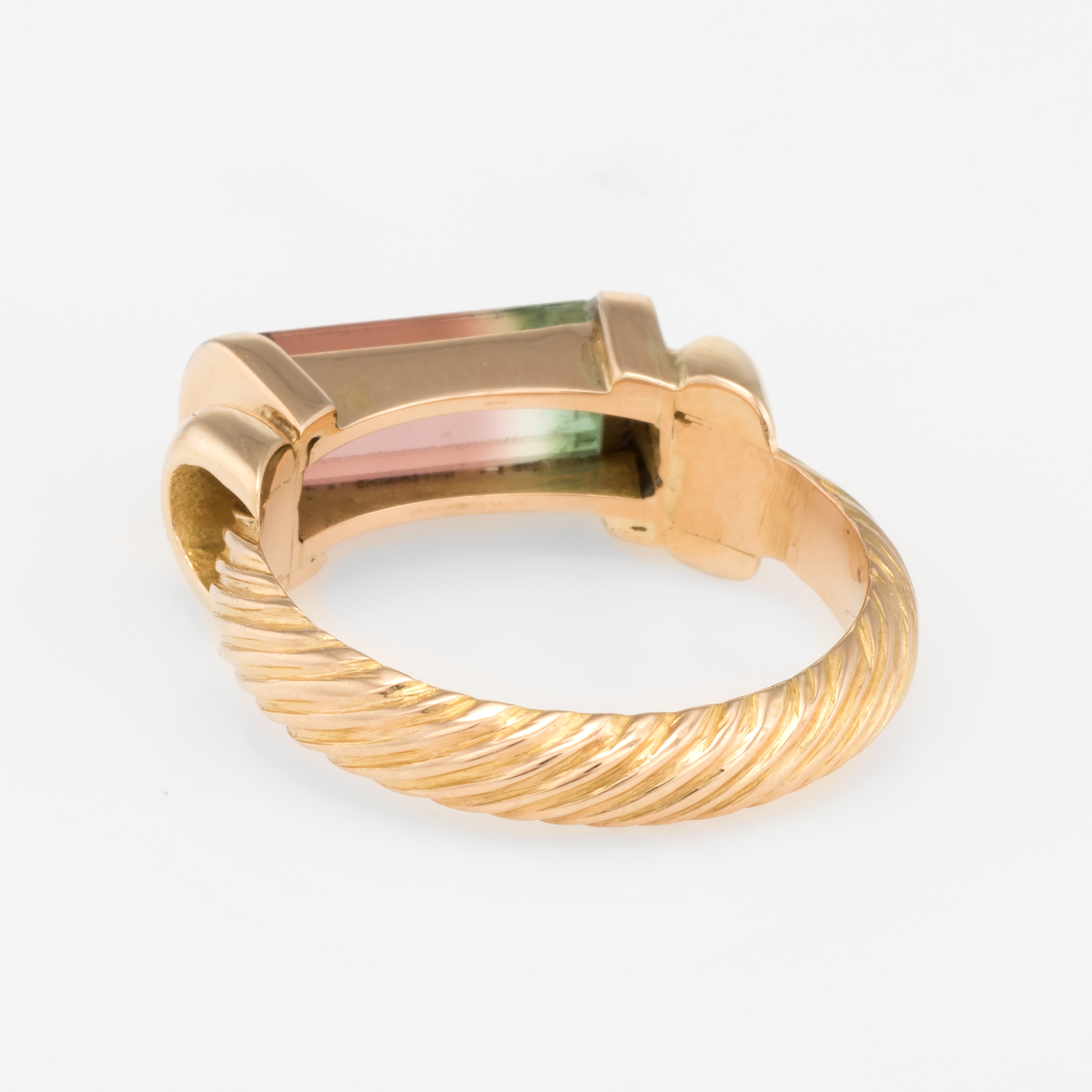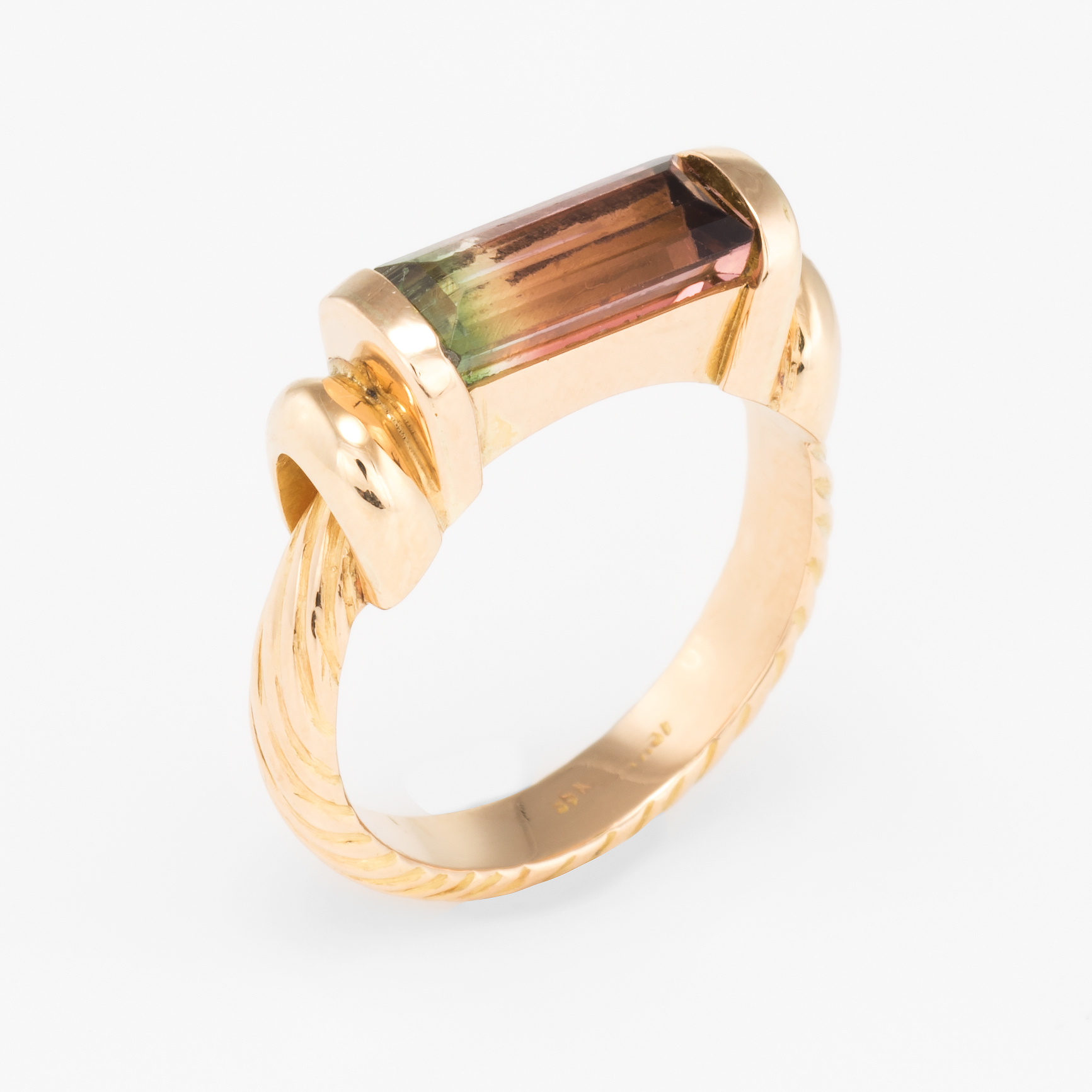 The ring is in excellent condition. Particulars: Weight: 5.4 grams Stones: Faceted watermelon tourmaline measures 11mm x 4.5mm. The tourmaline is in excellent condition and free of cracks or chips.