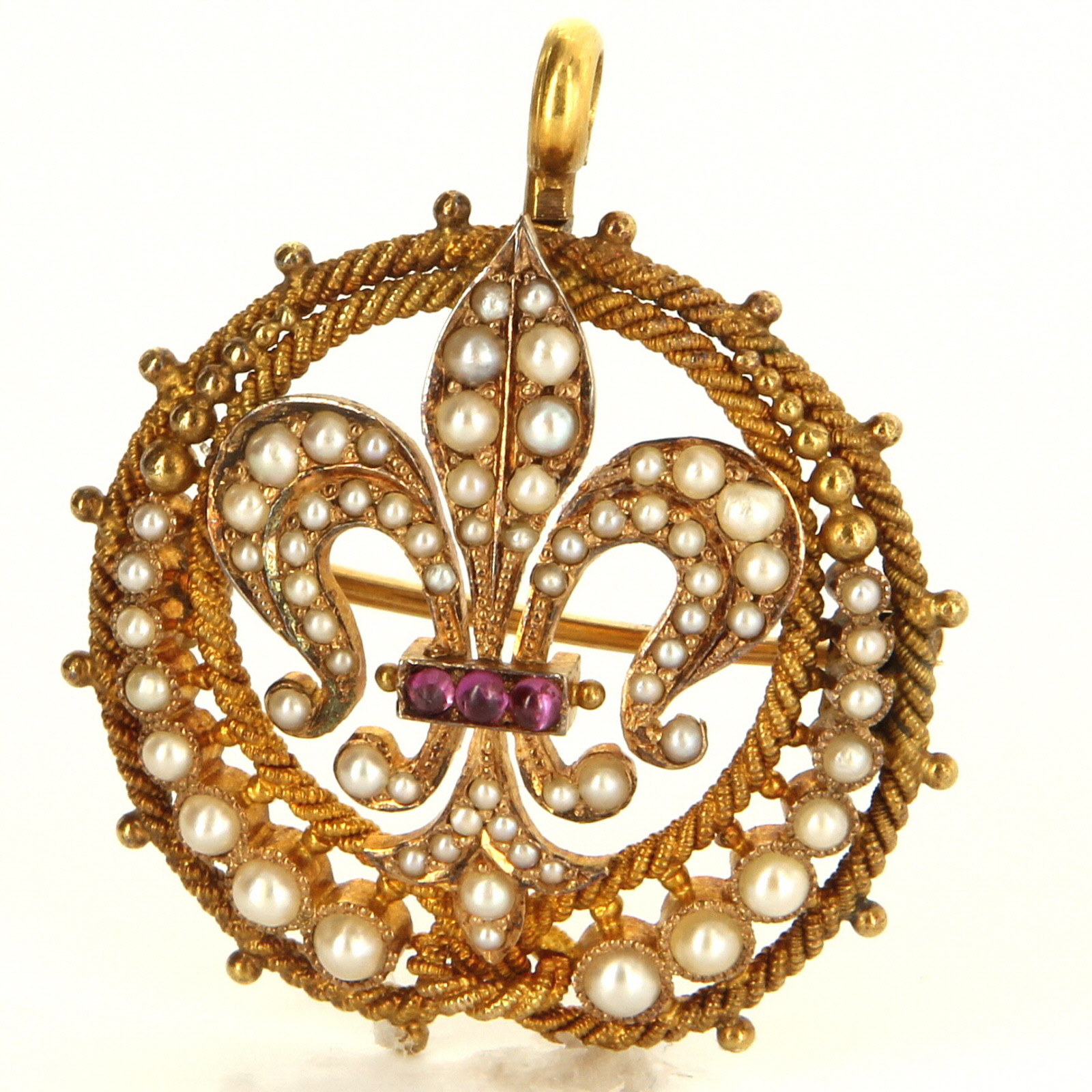 Seed pearls and cabochon cut rubies are set into ornate fleur de lis mount.