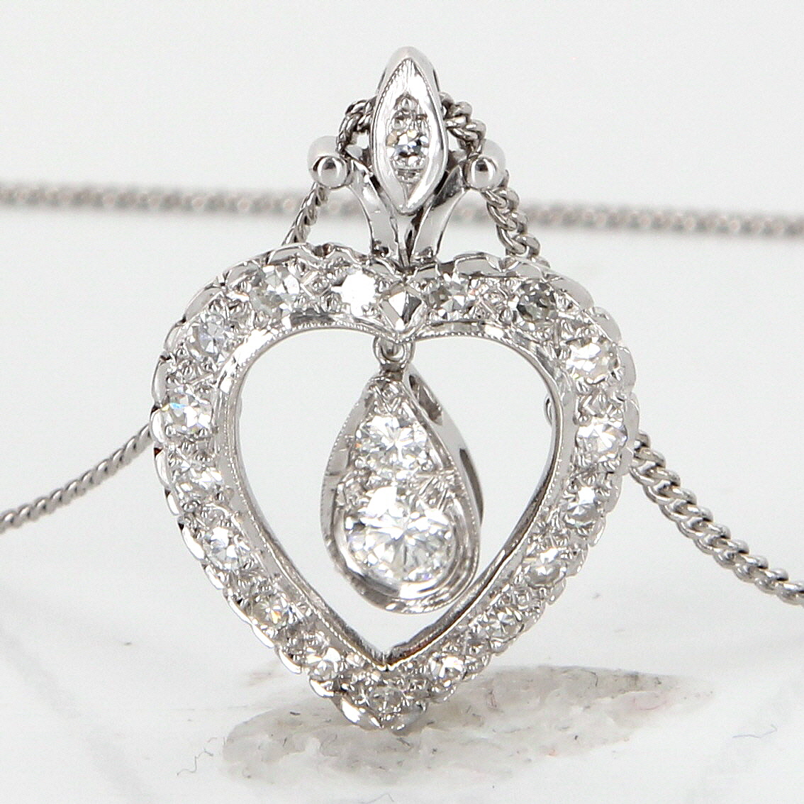 Offered for sale is a truly superb vintage heart pendant necklace crafted (circa 1940s-1950s), beautifully in 14 karat white gold (pendant) and 925 sterling silver (chain).