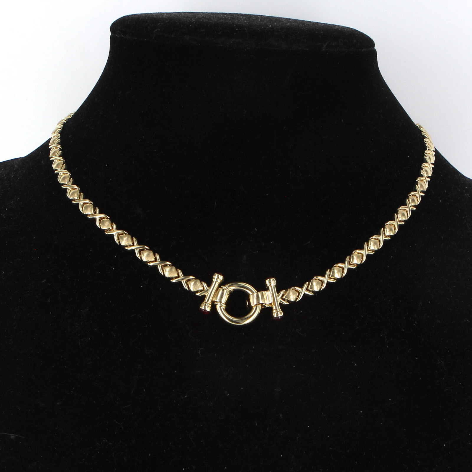 The necklace features a cross pattern with alternating brushed and polished gold links.