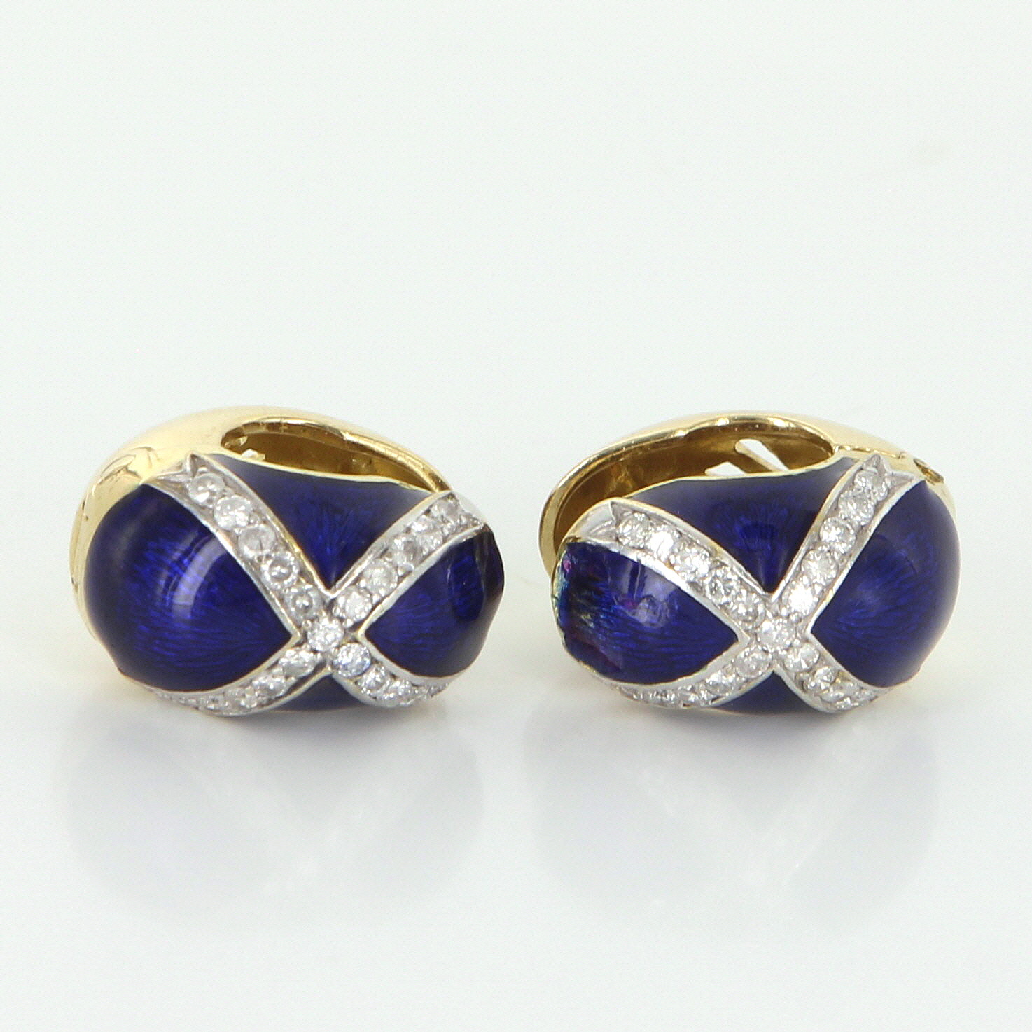 Blue Enamel Vintage Diamond Shrimp Earrings 18k Yellow Gold Estate Jewelry