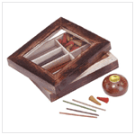 A fabulous array of incense inside a wood box. 120 sticks and 40 cones of incense (assorted scents) and a round wood holder with brass inlays. Glass window in lid. 6" x 5" x 1 1/2" high. 33005 $ 14.95