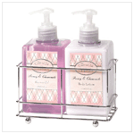 Pamper yourself with this luxurious set of shower gel and lotion, each infused with the soothing scent of peony and chamomile. 450ml shower gel and lotion, each in a pump dispenser and contained in a footed wire tray. 6" x 3 1/2" x 6 1/2" high. 38062 $ 9.95