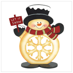 "Let It Snow!" declares the sign in this frosty fellow's hand; he even holds a lacy snowflake right at his very heart! Adorable standing wood figure is a fitting reminder of the frolicsome fun to be found in a snowy winter's day. Wood. 10 1/2" x 2 3/4" x 12" high. 39133 $ 14.95