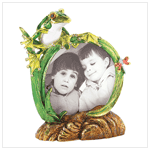 From atop his curved-leaf perch, a bejeweled green frog gazes down upon your favorite photo nestled below. Brilliant metallic enamelwork in vivid greens, golds and coppers add a splash of splendor to this sculpted photo frame! Holds a 2 3/4" x 2 2/3" photo. Pewter with glass cover. 4" x 1 1/8" x 4 3/4" high. 39035 $ 17.95