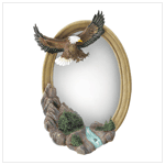 Wonderful wall art masterpiece is a doubly delightful decoration! Sculpted oval frame features a proud bald eagle soaring over his mountain home; mirrored center is an ideal inspiration for reflections upon nature’s beauty. Hook on back for hanging. Polyresin and glass. 12" X 3 3/4" 17" high. 12034 $ 59.95