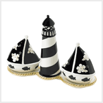 Add a crisp coastal theme to your table setting with this breezy set of nautical spice shakers! Bold and bright in black and white, a pretty pair of boats sets sail around an old-fashioned striped lighthouse. Each boat holds a generous helping of your favorite seasoning and nestles neatly into the matching tray. Dolomite. Hand wash. 9 1/8" x 3 1/4" x 6 3/4" high. Set. The following is provided in compliance with California law Prop. 65: WARNING: This product contains a chemical known to the State of California to cause cancer and reproductive toxicity $ 14.95