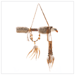 Decorative peace pipe carved with the image of a bold Bald Eagle is lined with fluffy rabbit's fur, leather straps, beads, and soft feathers. 13 1/2" x 2 1/2 x 21 1/2" high. 30734 $ 19.95
