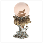 A sure-fire conversation starter, this dramatic lamp brings the beauty of the legendary wolf into your home! Perched atop the "birch branch" base, three wolves keep watch beneath the softly glowing "moon".Polyresin with 5 1/2" diameter glass globe. Light bulb not included. 6 1/4" diameter x 12 1/4" high. 37127 $ 59.95