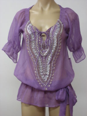 Scoopneck with beaded details and tie around neckline, elastic band at the waist with a tie. Short sleeves with elastic bands as well. This top is tunic style with a sheer fabric.