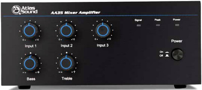 The Atlas Sound AA35, a 3 input channel mixer amplifier designed for distributed business paging and background music (BGM) systems, small to medium speech privacy systems and in applications where music on hold (MOH) plus paging is required.