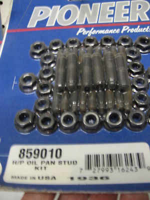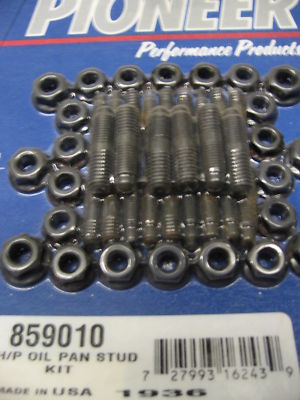 Pioneer Performance Oil Pan Stud Kit. U.S. manufactured from high strength alloy steel, heat treated to 180,000 PSI tensile strength and black oxide coated for corrosion protection. "Bullet Tipped" studs ease oil pan removal and installation and hi-tensile serrated hex flange nuts prevent loosening during operation. Conveniently Skin Packaged.