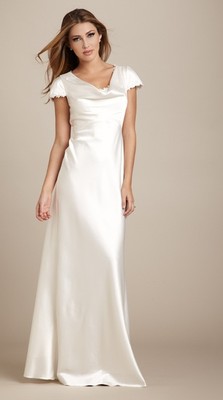Manufacturer's Description: Satin gown Draping cowl neckline and cap sleeves with floral lace trim Scoop neck insert with floral lace trim Flattering curved seaming across empire waist A-line skirting Hidden back zip closure with decorative button accents on placket Fuly lined Approximate measurement (size 8): Dress: sleeve length 5", shoulder to hem 52" The mannequin shown in the pictures is size 5 and about 5'8 tall
