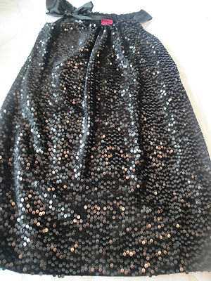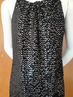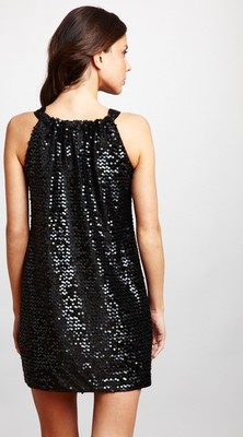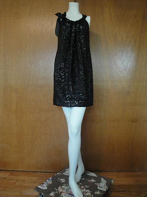 Manufacturer's Description: Sleeveless dress Cinched neck detail Satin shoulder straps with side tie details Metallic sequin embellishment fills bodice Pullover style Fully lined Approximate measurement (size 4): shoulder to hem 32" The mannequin shown in the pictures is size 5 and about 5'8 tall