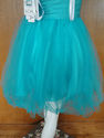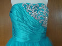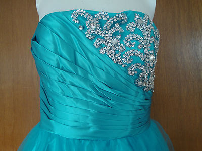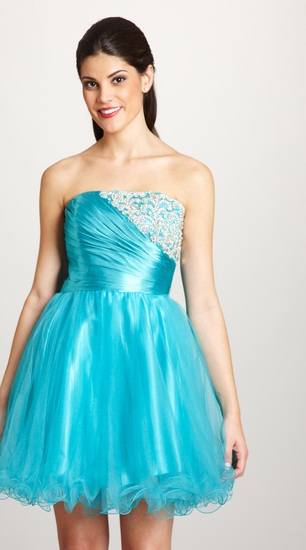 Manufacturer's Description: Strapless dress Bodice features allover pleating detail and rhinestone applique Skirt features tulle overlay with a ruffled hem Bodice features cups for shaping Fully lined with hidden side zip closure Includes optional shoulder straps Approximate measurement (size 4): Top to hem 29" The mannequin shown in the pictures is size 5 and about 5'8 tall