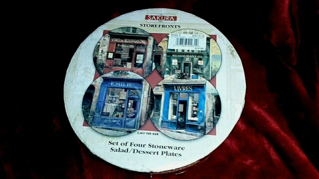 New Sakura Storefronts Set Of Four Stoneware Salad/dessert Plates. Condition is New. Shipped with USPS Priority Mail.