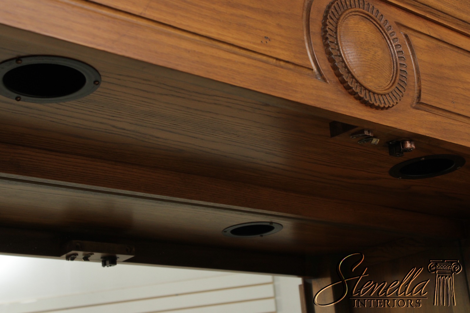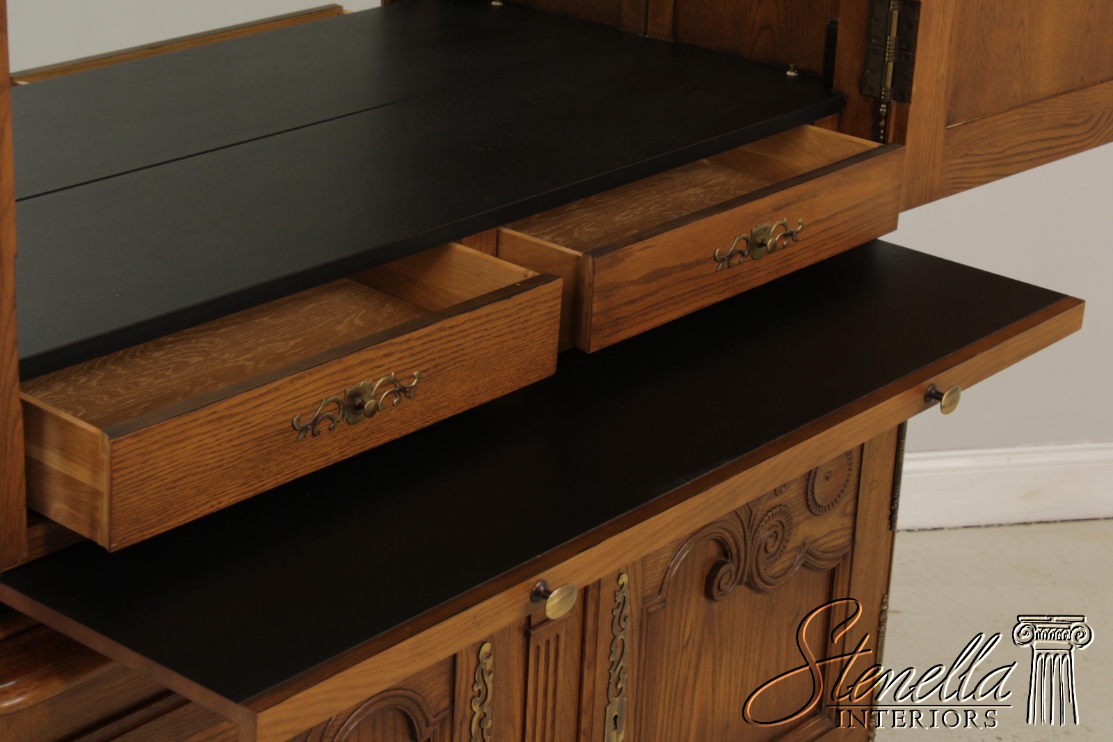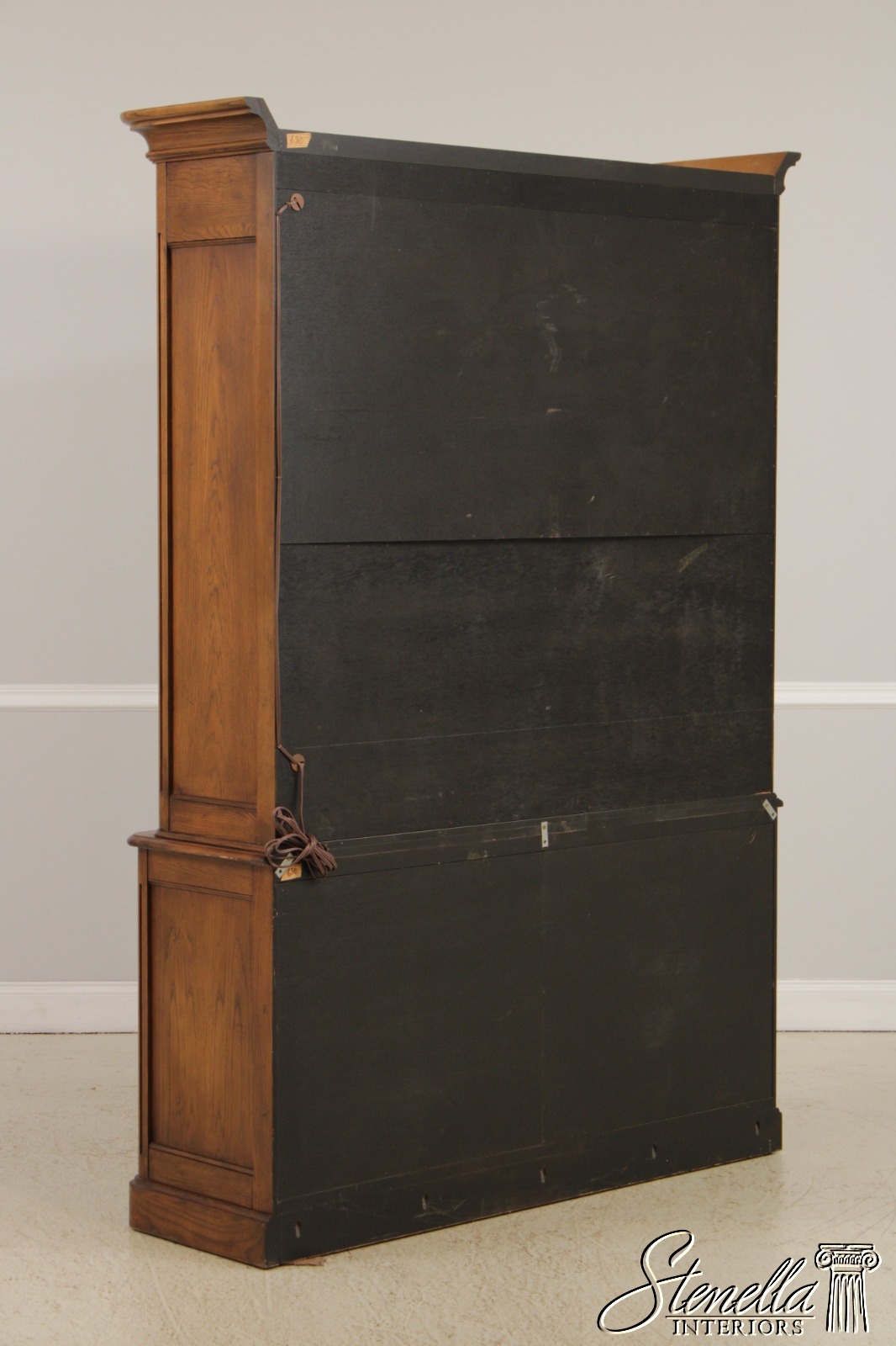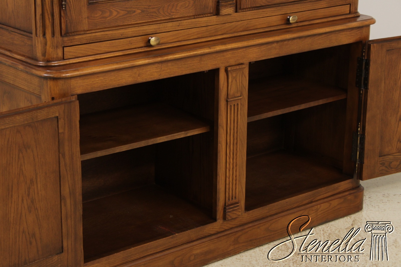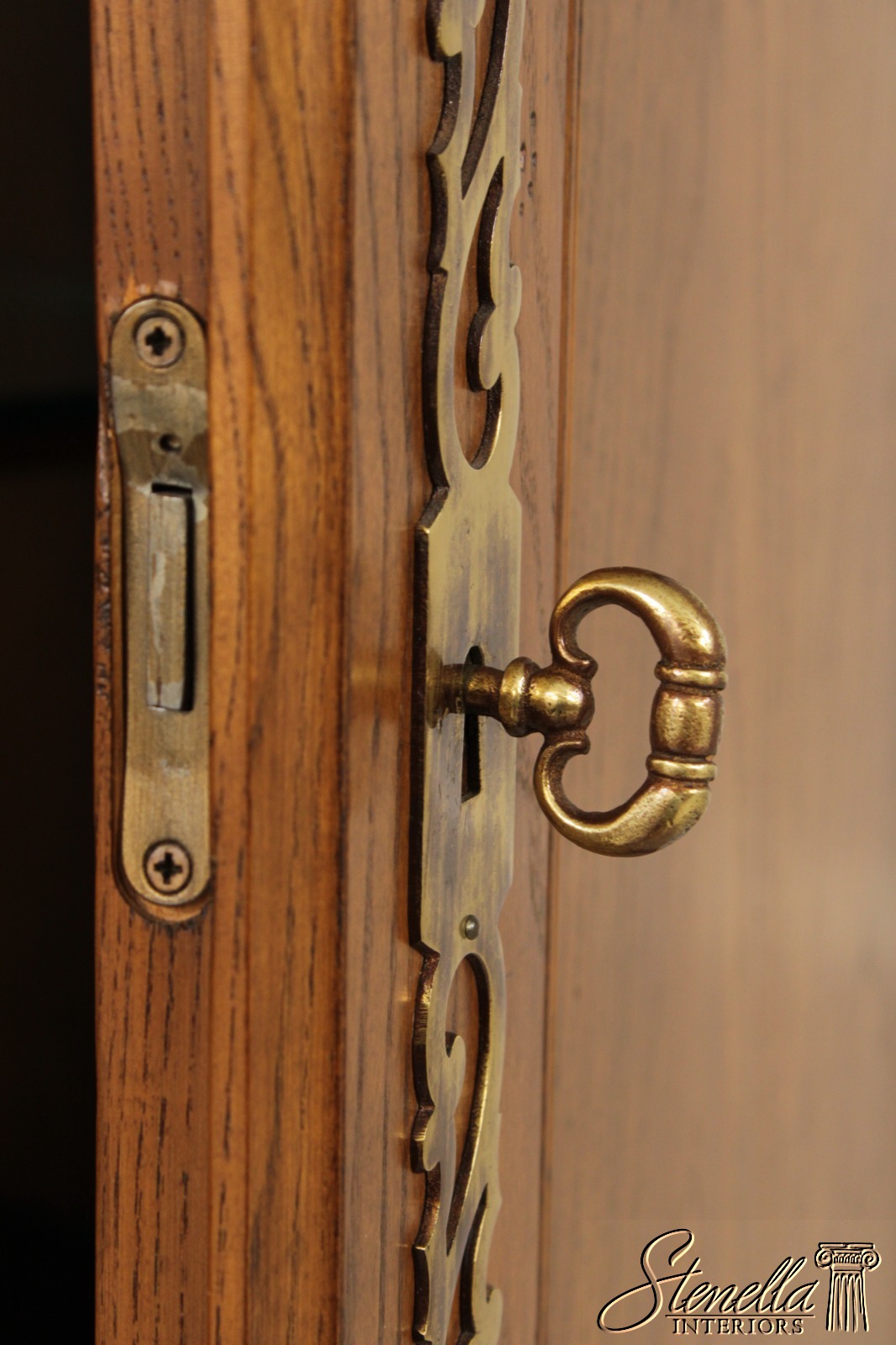 Details: Adjustable Shelves Dovetailed Drawer Construction Fine Carved Details High Quality Construction Large Impressive Cabinet Lighted Interior Mirrored Back Quarter Column Sides Raised Panel Doors Oak w. Walnut Finish Traditional Style Solid Brass Hardware Pull Out Surface Key Locking w. Key 2 Pieces Offered @ Fraction Original Retail Cost