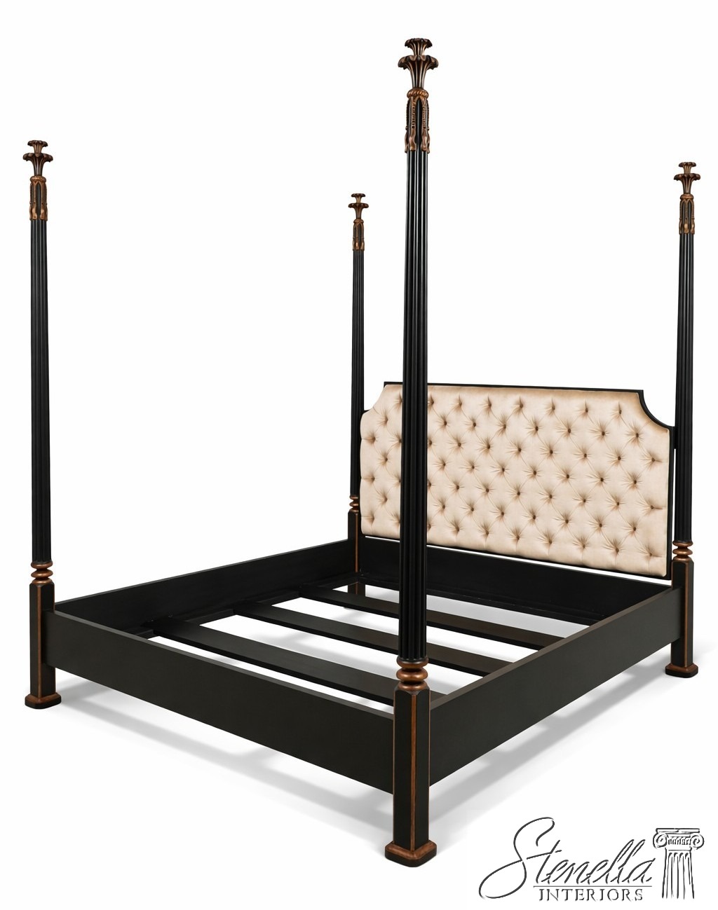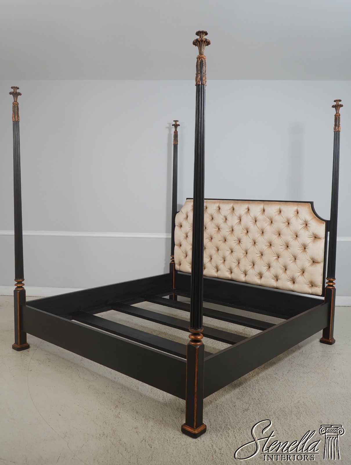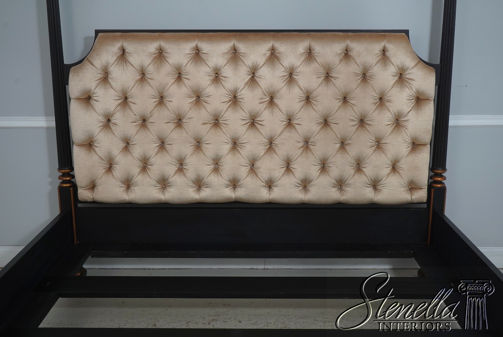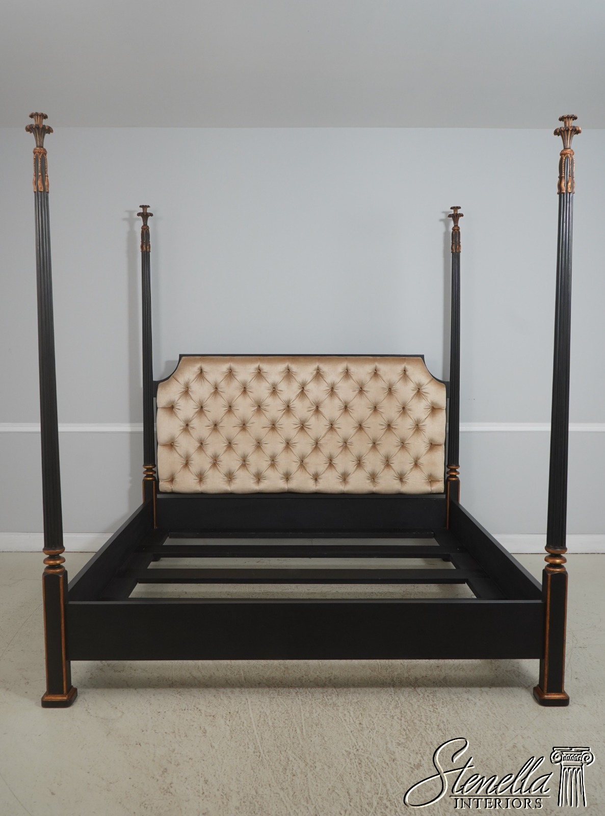 Details: Black Finish w. Gold Highlights Ornate Finial Tops High Quality Construction Large Impressive Bed Tufted Upholstered Headboard Tassel Carved Posts Nancy Corzine Design Un-Marked as To Manufacture Fluted Posts Offered @ Fraction Original Retail Cost