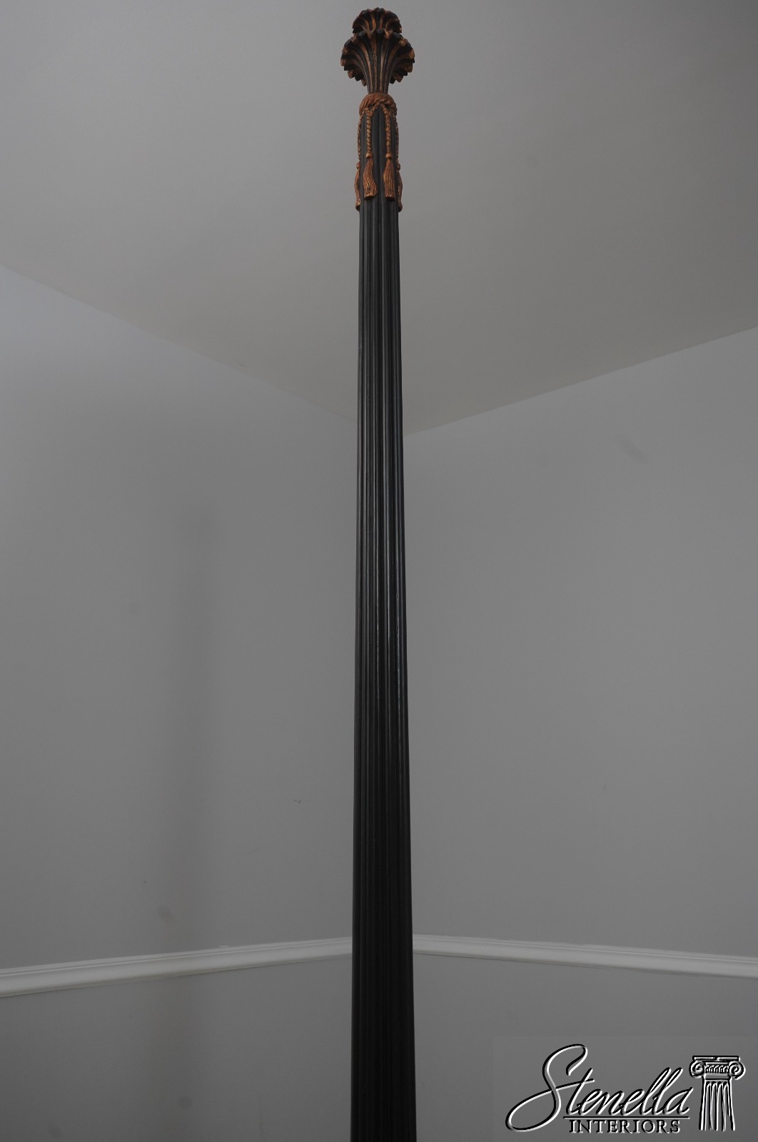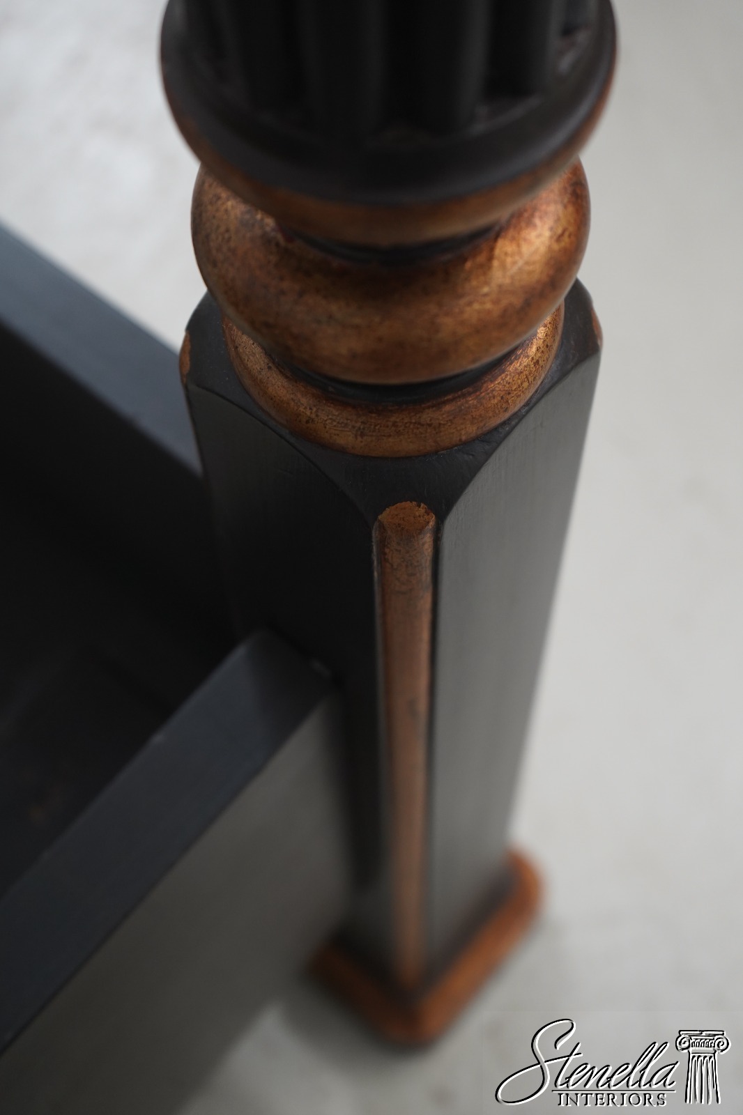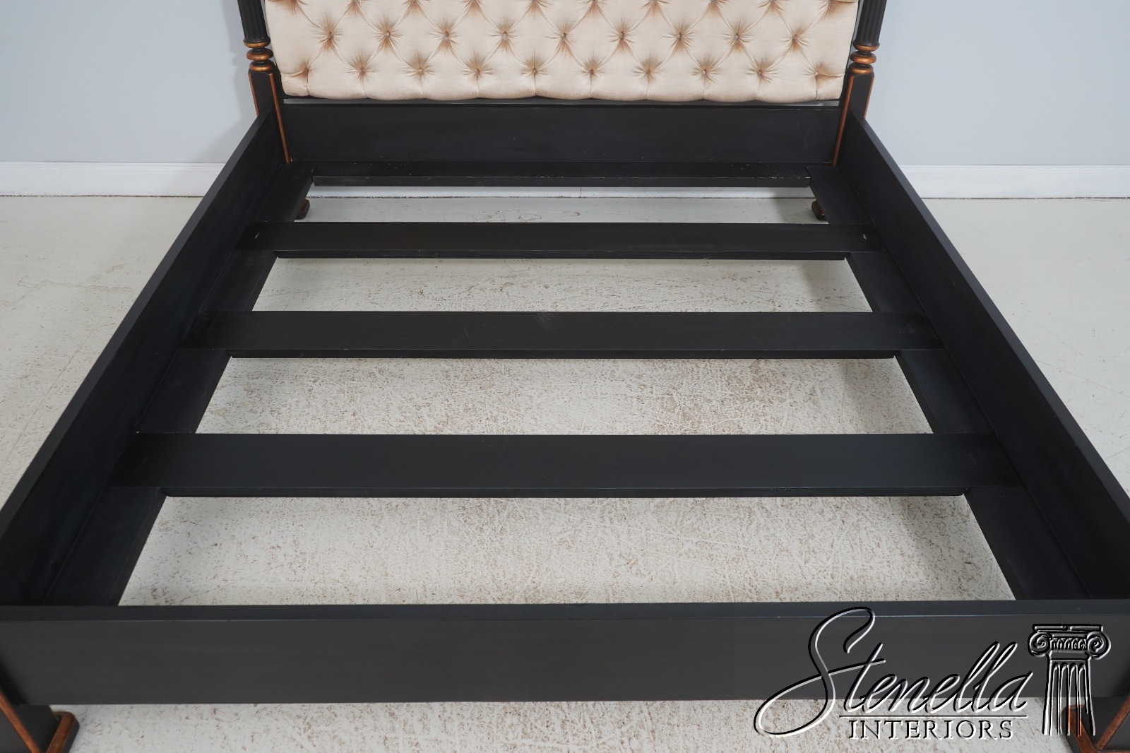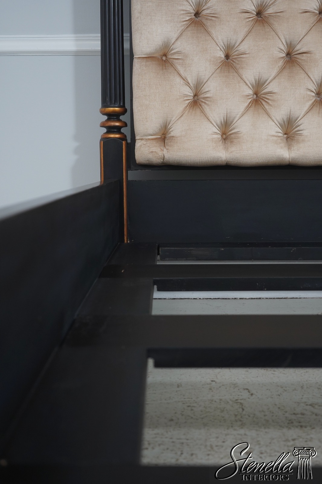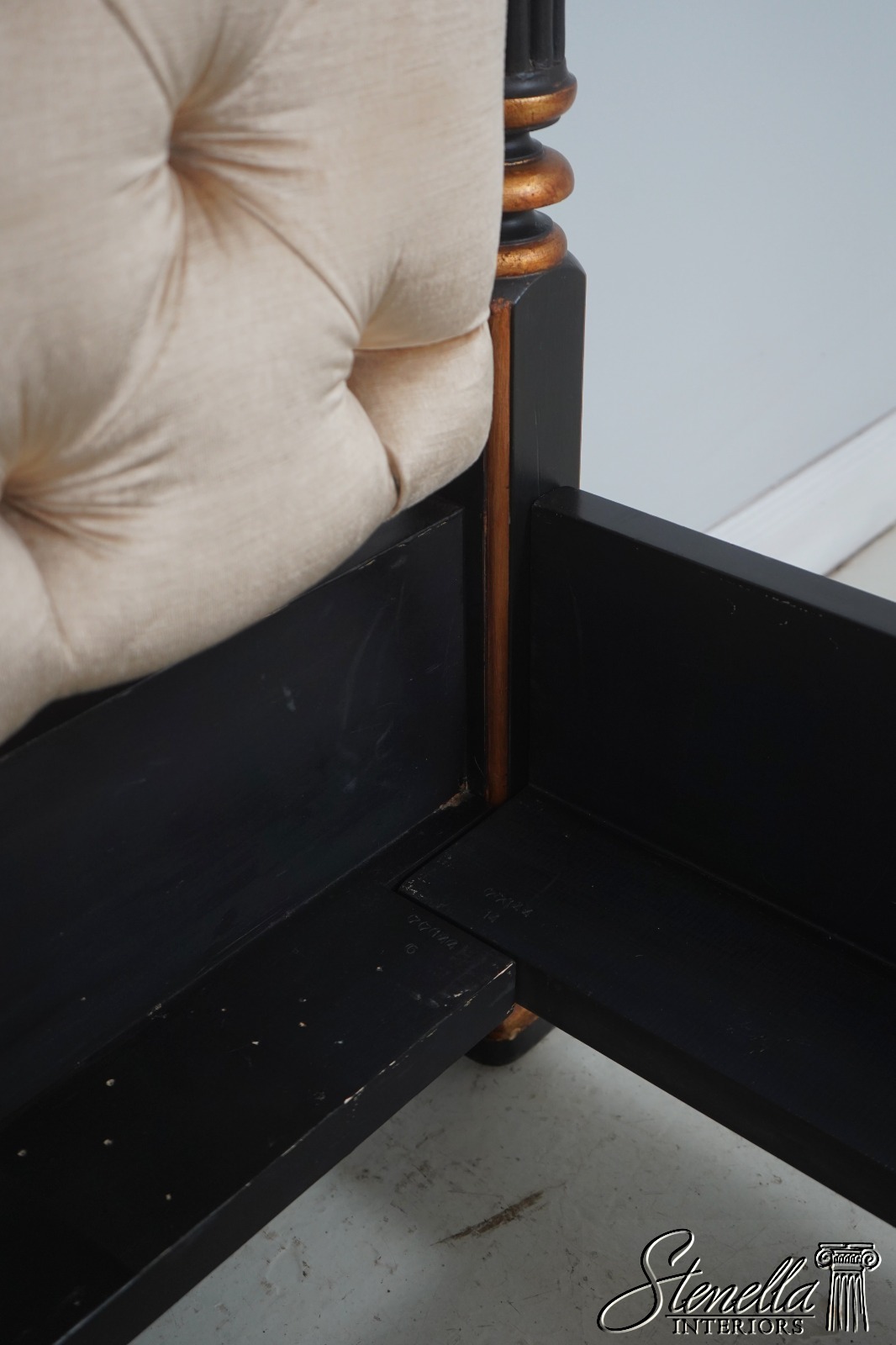 Details: Black Finish w. Gold Highlights Ornate Finial Tops High Quality Construction Large Impressive Bed Tufted Upholstered Headboard Tassel Carved Posts Nancy Corzine Design Un-Marked as To Manufacture Fluted Posts Offered @ Fraction Original Retail Cost