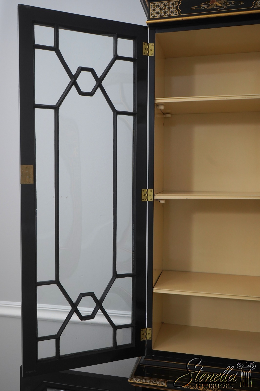 Details: 3 Piece w. Removable Crown Hand Dovetailed Drawer Construction High Quality Construction English Style Slightly Convex Glass Panels Stunning Chinoiserie Decorated Finish Bench Made Hand Crafted Individual Pane Glass Doors