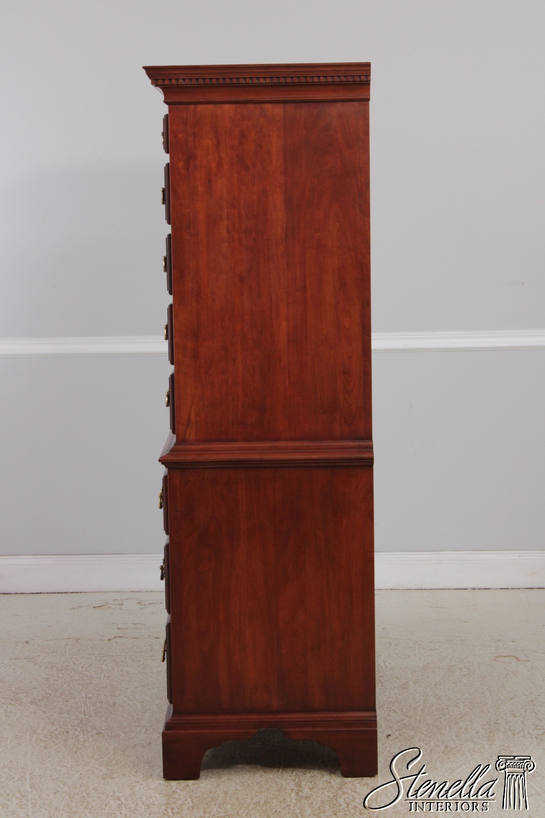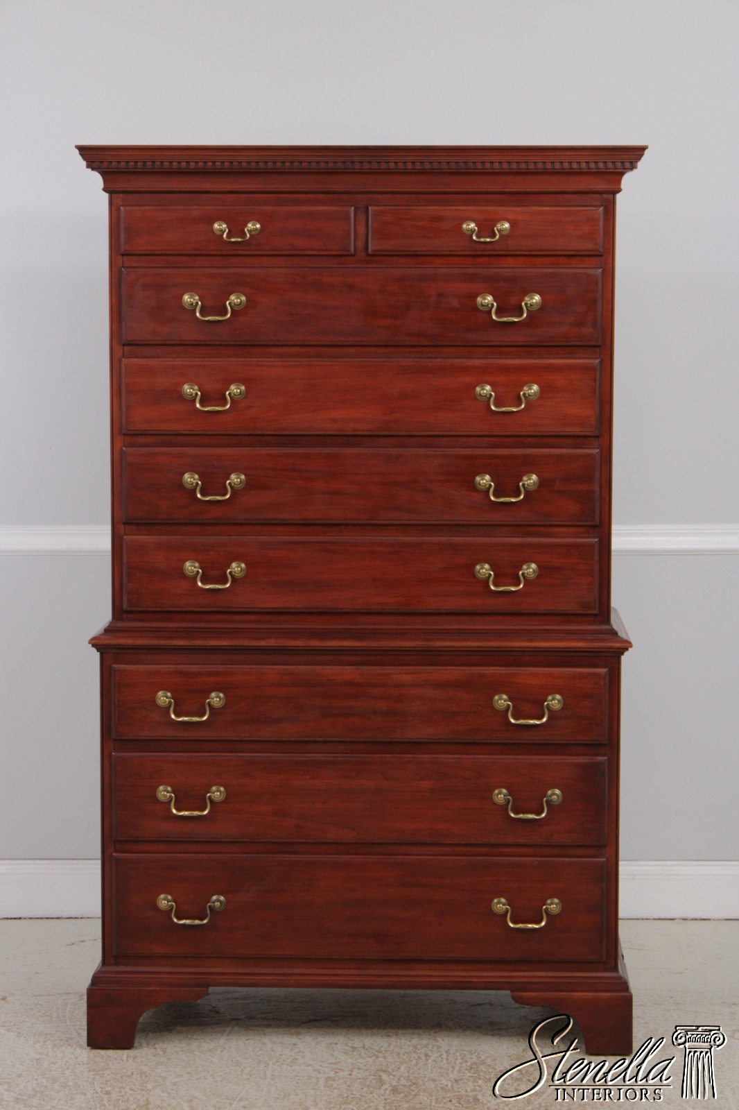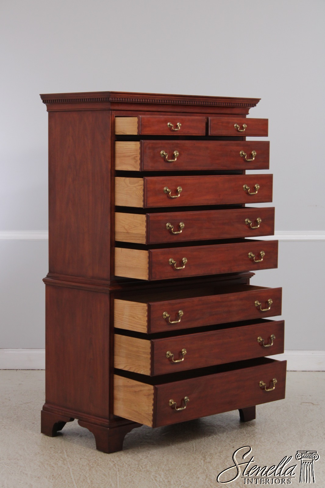 Details: Finish no.24 Model 164 Cherry Bracket Feet Dovetailed Drawer Construction High Quality Construction Large Impressive Cabinet Chippendale Style Dentil Crown Molding Solid Brass Hardware Graduated Drawers Offered @ Fraction Original Retail Cost