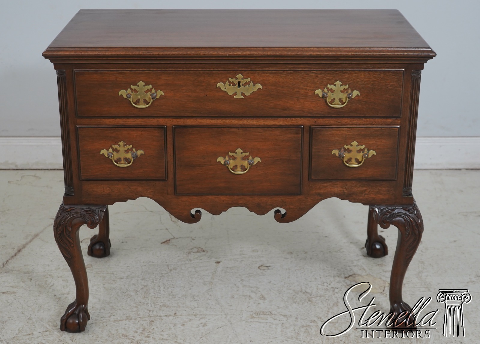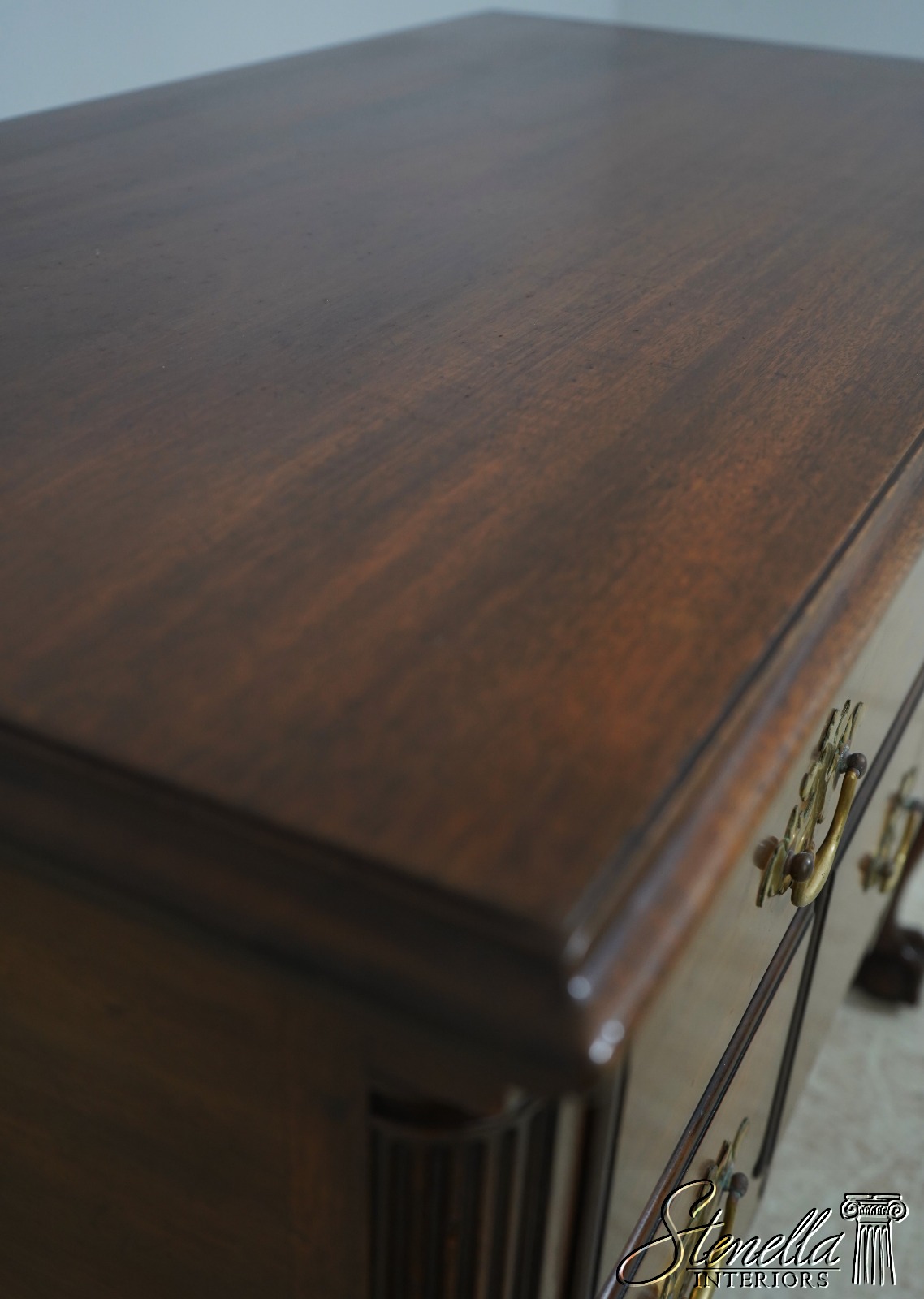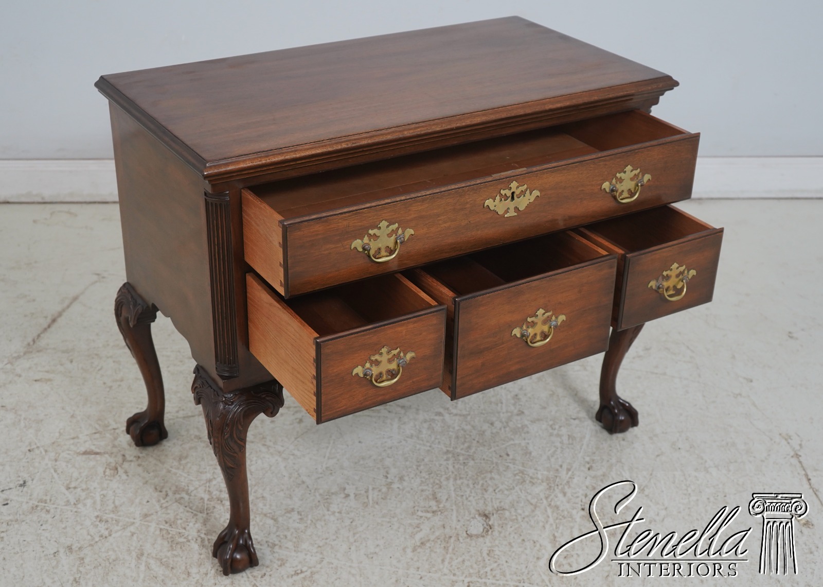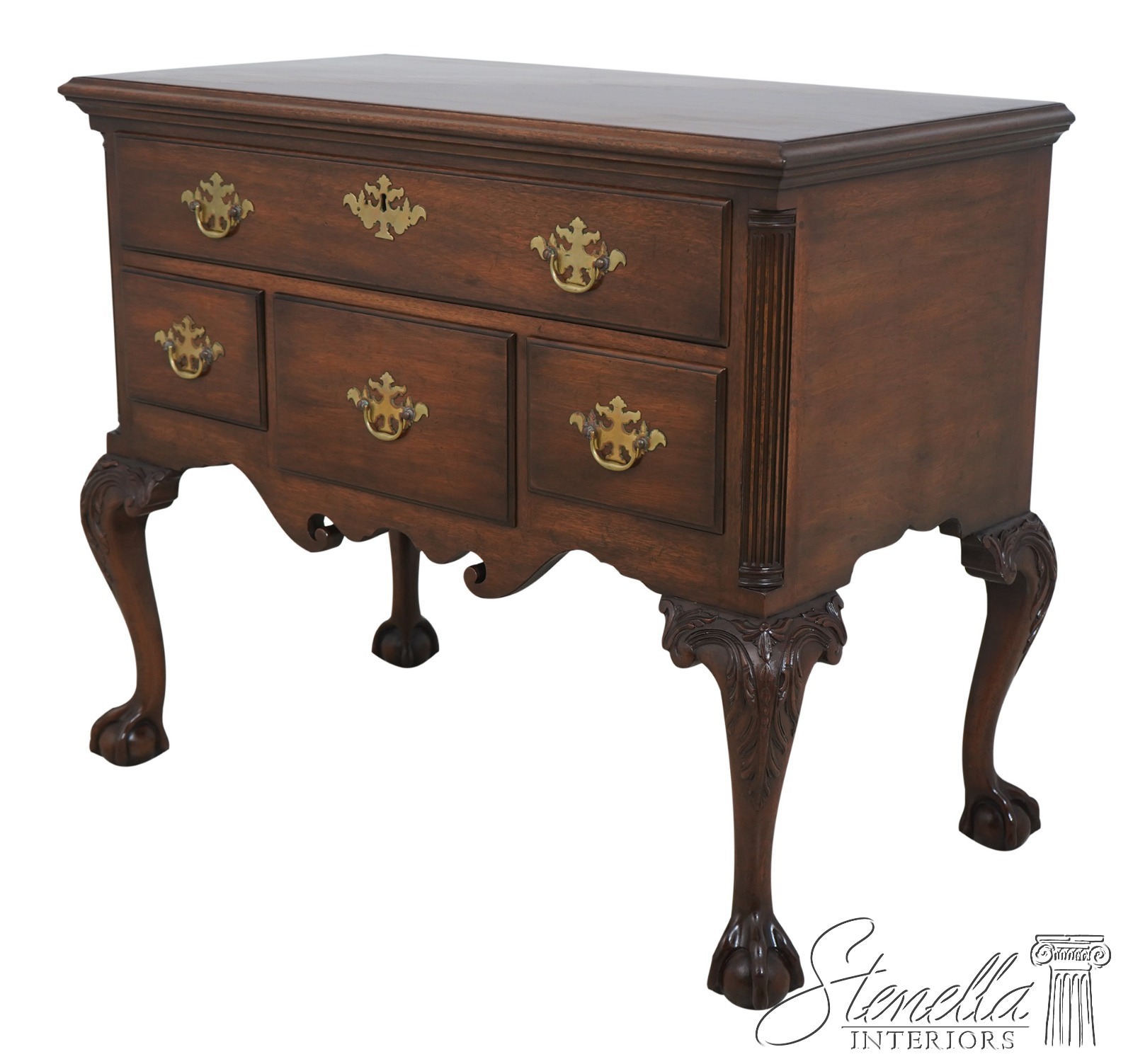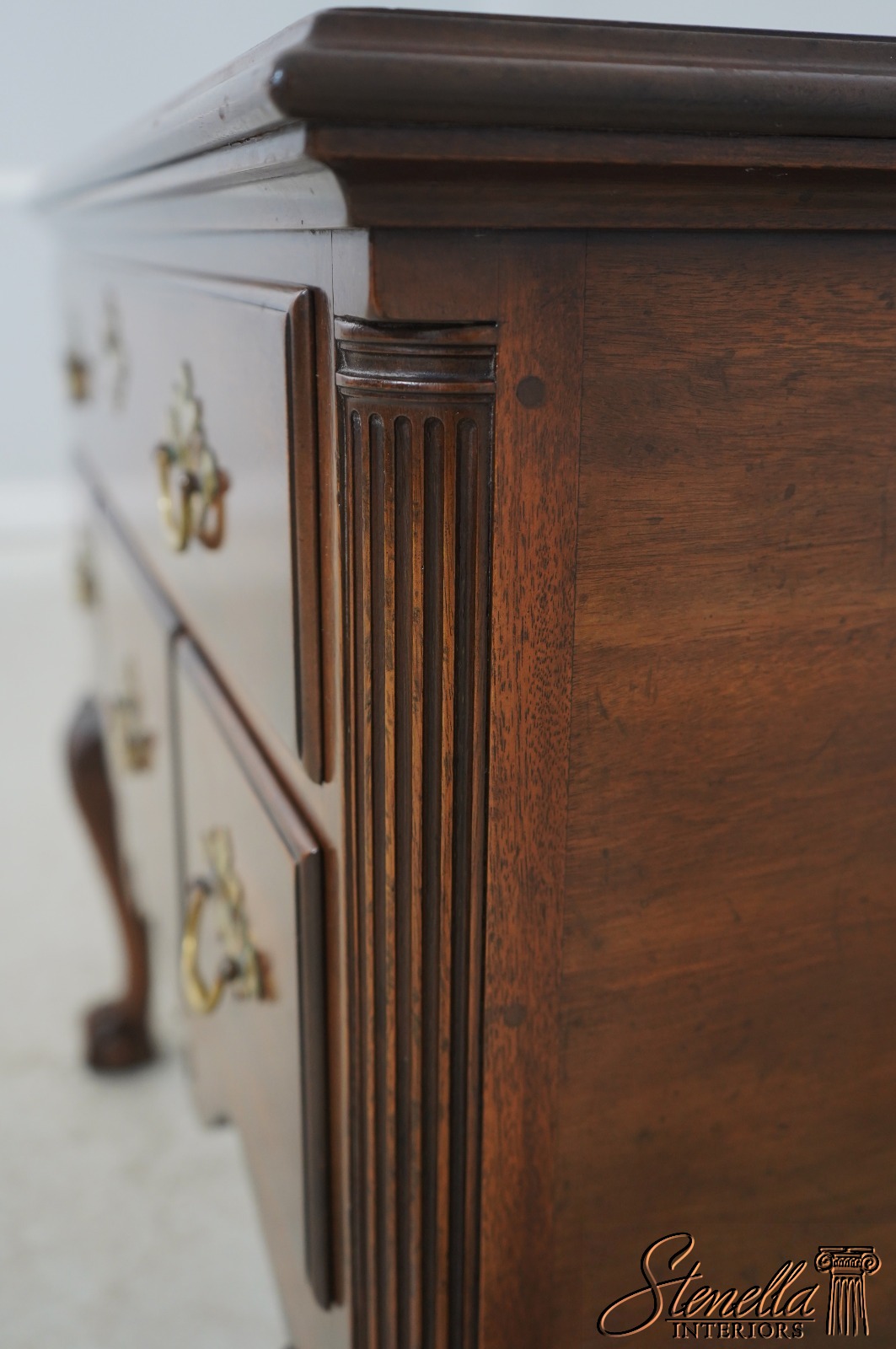 Chippendale style with fluted columns, carved cabriole legs with claw-and-ball feet. Adorned with acanthus leaf carvings. Brass hardware. One drawer over three drawers. Original is circa 1760.