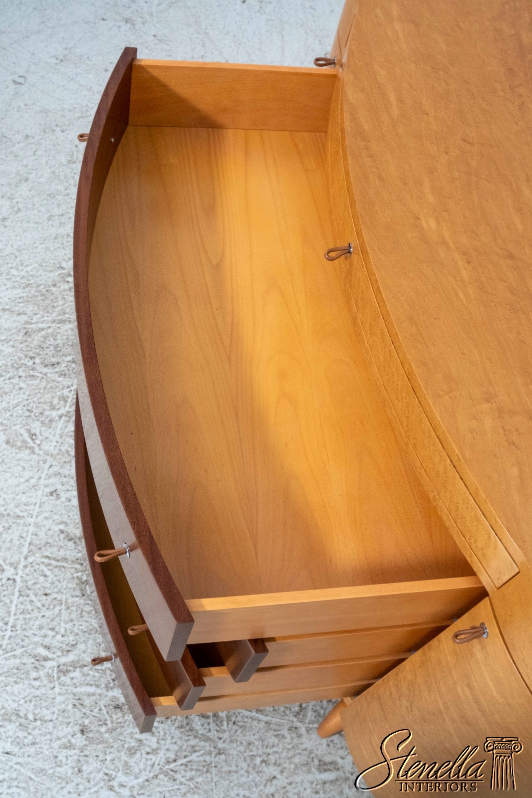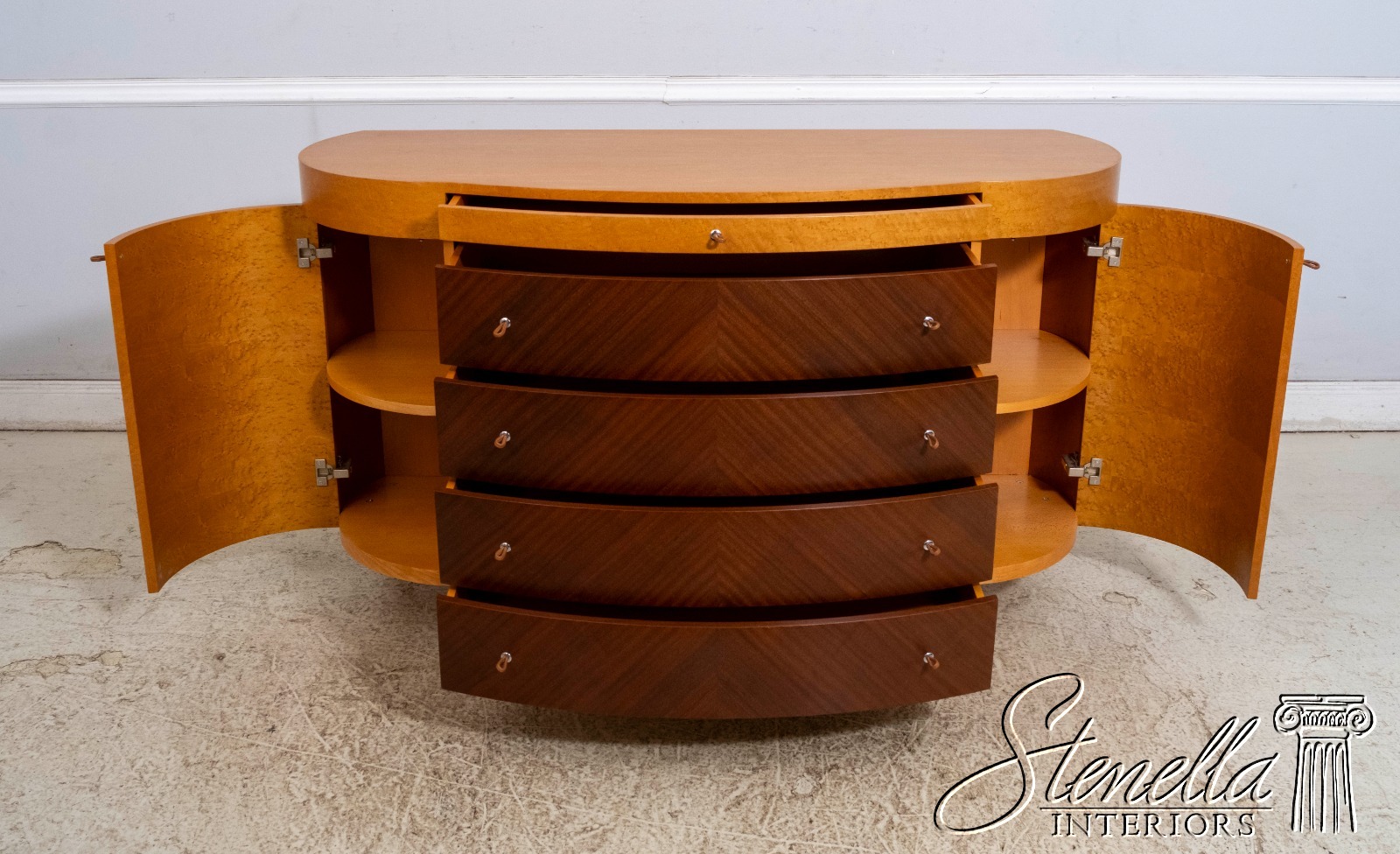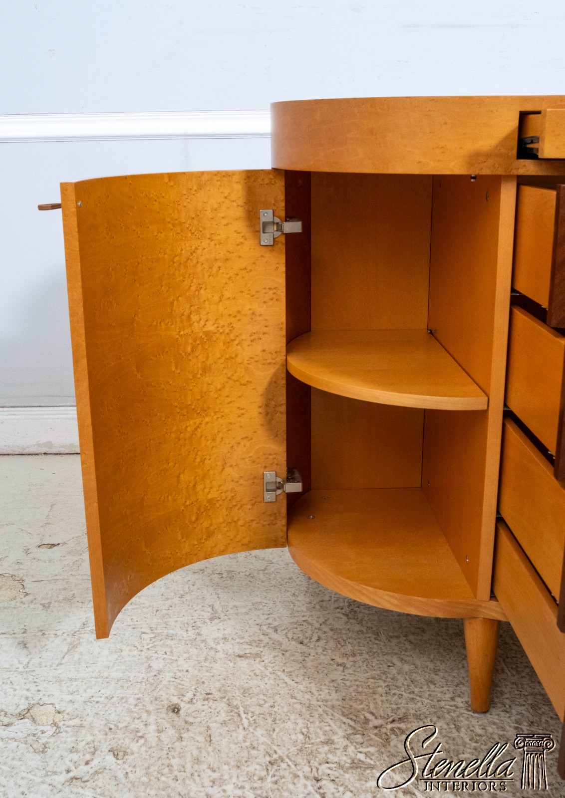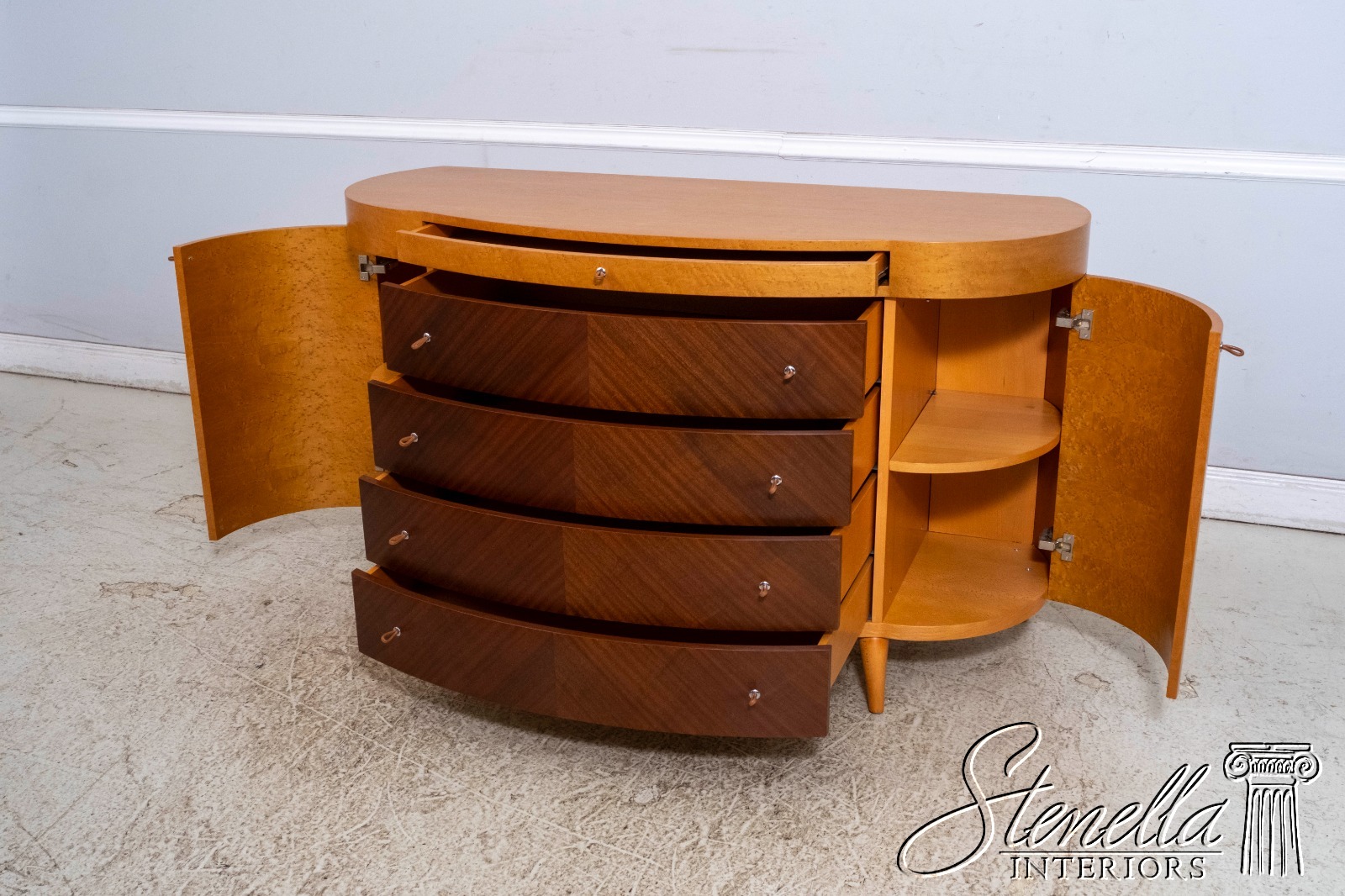 Details: Adjustable Shelves Makes Great Dresser, Console Or Used Under TV High Quality Construction Large Impressive Cabinet Nice Inlay Work Throughout 5 Drawers - Leather Pulls Stunning Birdseye Maple Case w. Mahogany Drawer Fronts Traditional Style Maple Tapered & Curved Legs Rounded Side Cabinets Un-Marked As To Manufacture Serpentine Front Offered @ Fraction Original Retail Cost